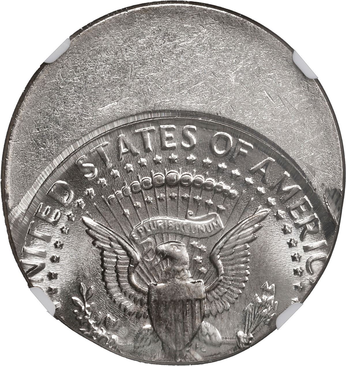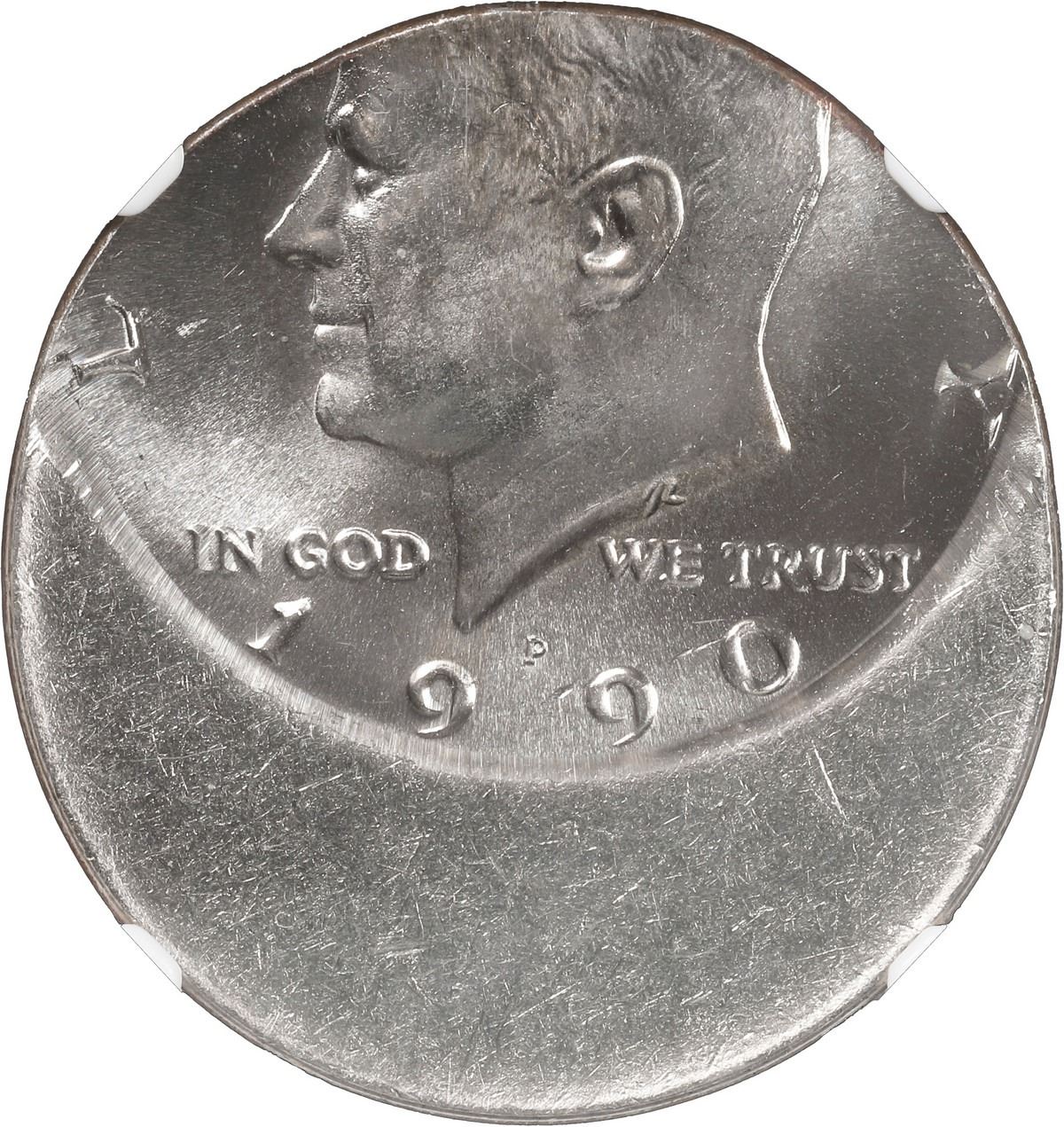 UNITED STATES, Philadelphia mint, copper-nickel Kennedy half dollar, 1990-P, struck 35% off-center error, NGC Mint Error MS 66, ex-Busto. grams. A dramatic error (and a Gem example at that) with a full date, mintmark, and most of Kennedy's head visible on this struck-off-center piece, a few hints of golden toning in and around the design. Pedigreed to the José Busto Collection.