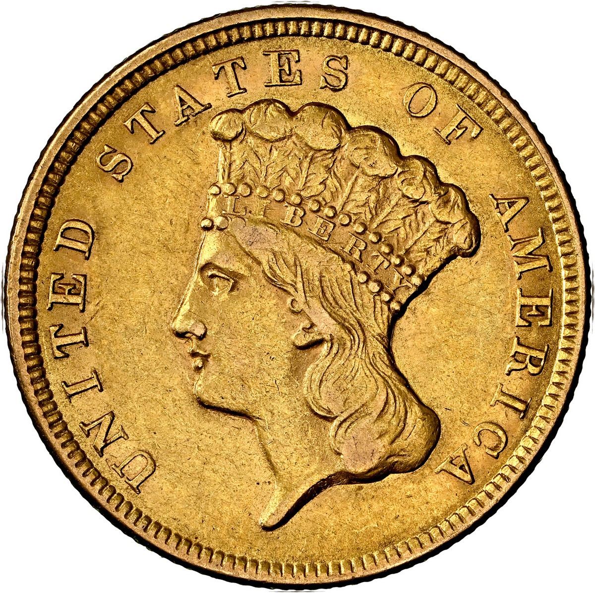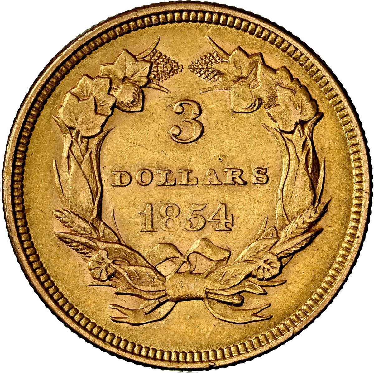 UNITED STATES, Philadelphia mint, gold $3 Indian princess, 1854, NGC AU 55. KM-84. Popular denomination struck to facilitate the purchase of 100-count 3-cent stamp sheets. Mintage of 138,618 pieces. Nice, bold design with just light wear on the hair curls of the Indian princess, strongly struck wreath with full date, rich golden surfaces with plenty of luster and touches of pink-gold toning around the legends.
