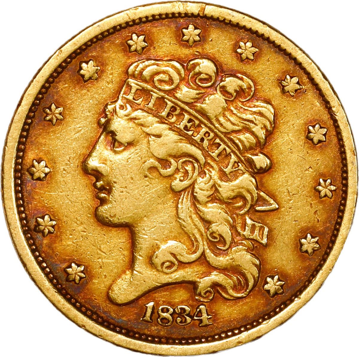 UNITED STATES, Philadelphia mint, gold $5 Classic Head Liberty "half eagle," 1834, plain 4. KM-57. 8.28 grams. VF with nice toning, once previously cleaned. Pedigreed to the Davissons auction of December 2018, with original lot-tag 19403.
