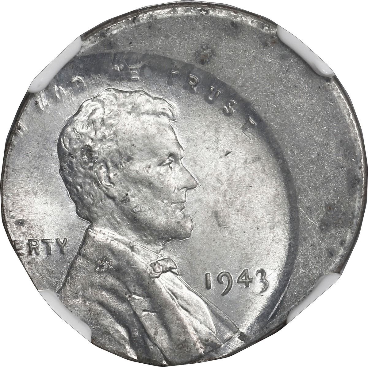 UNITED STATES, Philadelphia mint, steel Lincoln cent, 1943, struck 20% off-center error, NGC Mint Error MS 62, ex-Busto. grams. Interesting error from this popular one-year type struck to save copper for the war effort, quite lustrous with a little spotting. Pedigreed to the José Busto Collection.