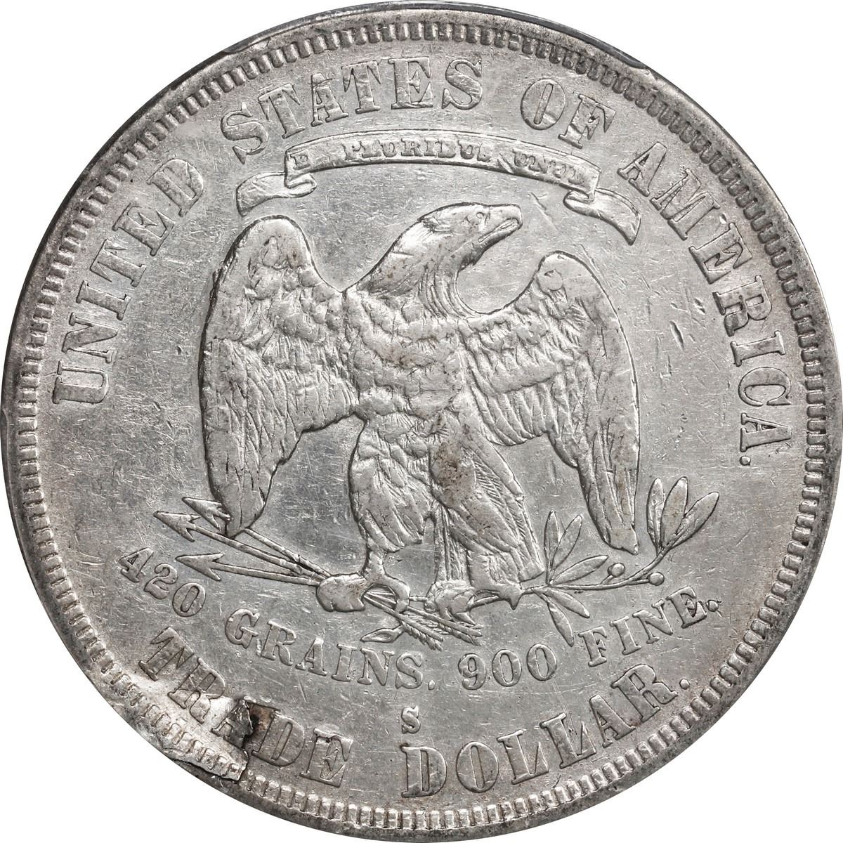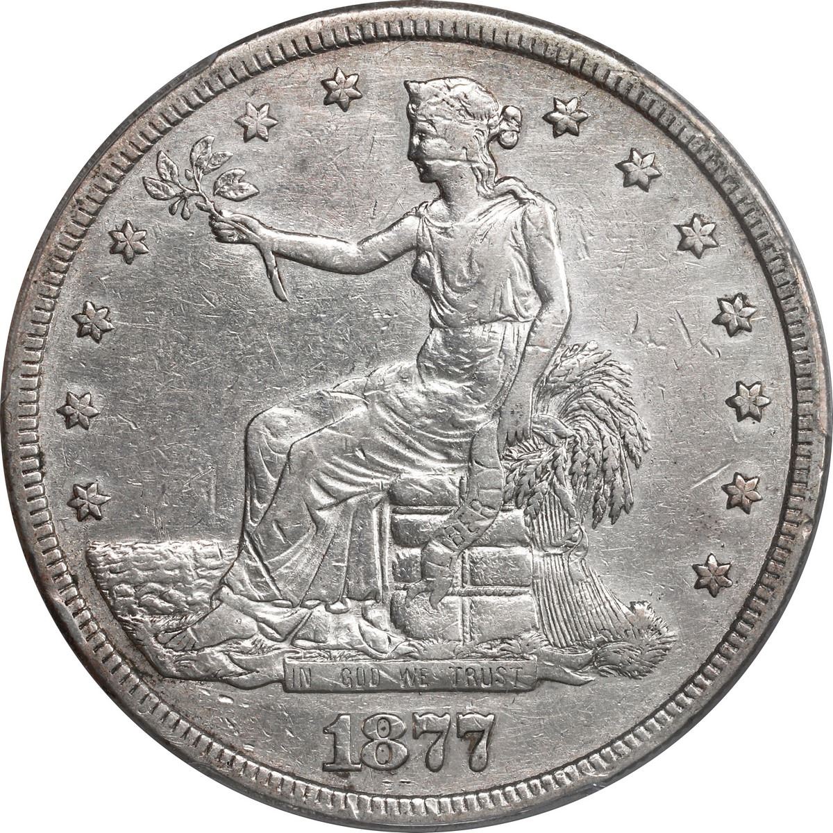 UNITED STATES, San Francisco mint, Trade dollar, 1877-S, raised and retained lamination flap error, PCGS XF40, ex-Busto. Slabbed with the reverse facing out to the show off the ¼" lamination flap sticking up across TRADE at 7 o'clock, its retention miraculous considering the circulation this Trade dollar encountered. Otherwise quite bold with some minor circulation chatter in the fields, plentiful luster but very little toning. Pedigreed to the José Busto Collection.