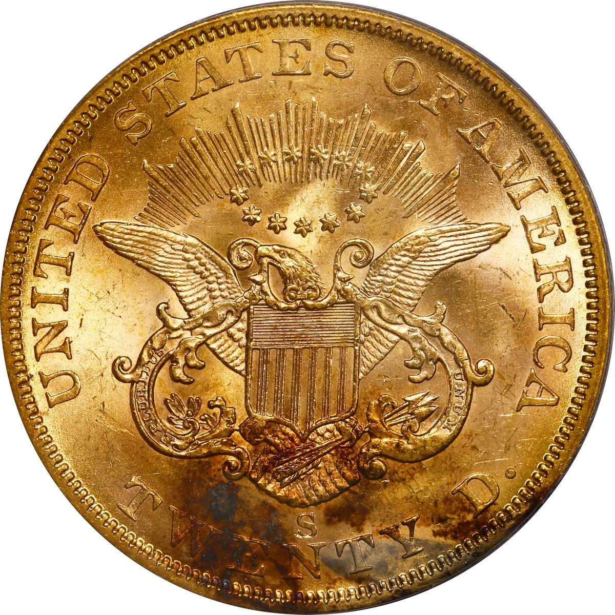 UNITED STATES, San Francisco mint, gold Coronet Liberty Head double eagle ($20), 1857-S, 20E broken A, PCGS AU58 (S.S. Central America Gold Foil Label). KM-74.1. Beautiful and richly toned example of this popular "Ship of Gold" double eagle with nice details across Liberty and the eagle, housed in the original gold foil label from the first salvage operation, with a few spots of vivid toning under the eagle (occasionally seen on gold coins recovered from this wreck) and minor bagmarks but little to no indication of wear as a then-freshly minted coin when the S.S. Central America went down. Recovered from: S.S. Central America, sunk in 1857 off North Carolina