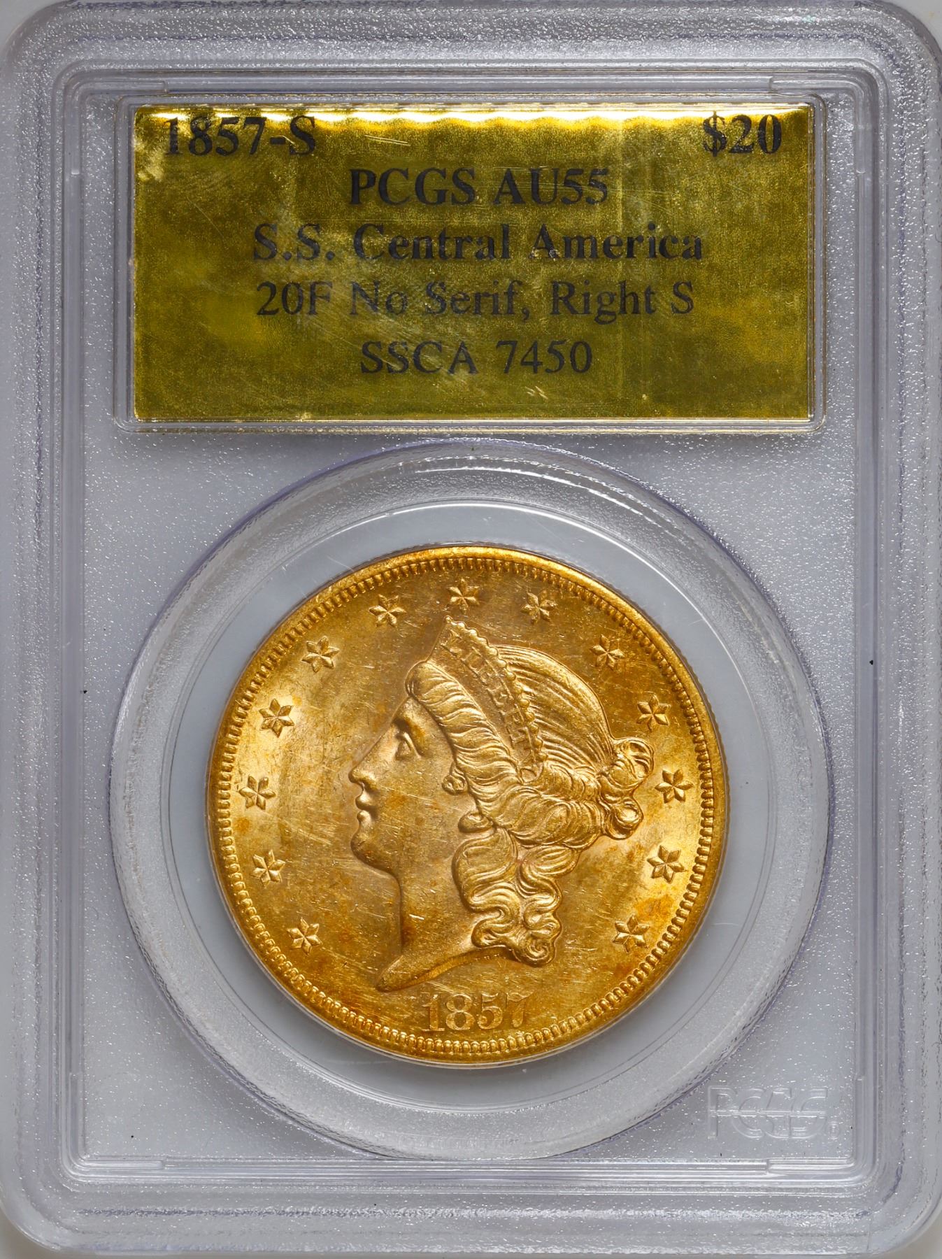 UNITED STATES, San Francisco mint, gold Coronet Liberty Head double eagle ($20), 1857-S, PCGS AU55 (SS Central America Shipwreck Gold Foil Label). KM-74.1. A very beautiful shipwreck piece that bears only the lightest of surface friction to denote any pre-sinking handling while retaining the bright mint luster and sharp details one might expect from a coin fresh out of the mint. Rich golden toning is prevalent along the edges and in some spots across and around Liberty. Recovered from: S.S. Central America, sunk in 1857 off North Carolina