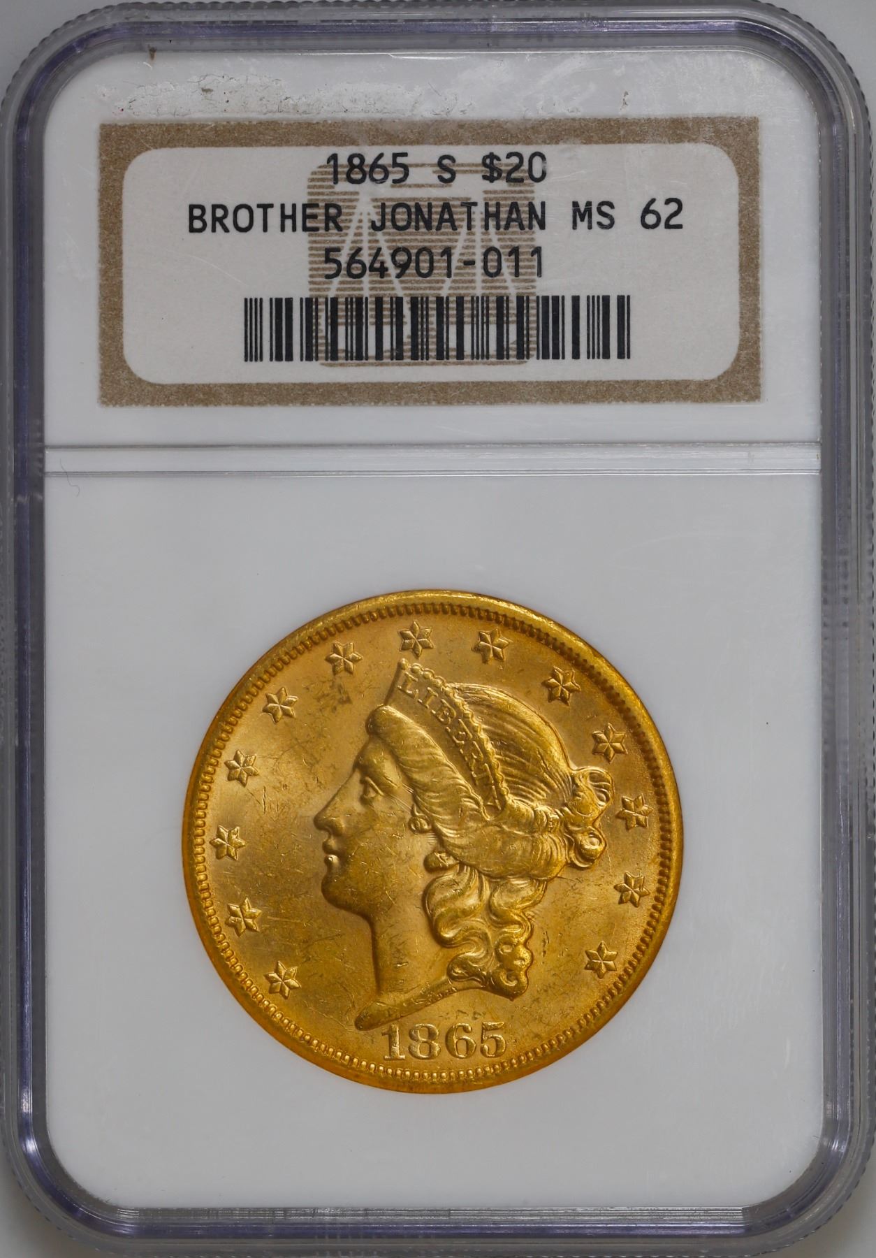 UNITED STATES, San Francisco mint, gold Coronet Liberty Head double eagle ($20), 1865-S, NGC MS 62 / Brother Jonathan. KM-74.1. The S.S. Brother Jonathan sank on July 30, 1865, after striking a rock during its return to the harbor of Crescent City, California. Just nineteen people survived aboard a single lifeboat. Of the 225 lives lost, some notable passengers included: Anson G. Henry, a personal friend of Abraham Lincoln's and the newly appointed Superintendent of the proposed Dalles (Oregon) branch mint; James Nisbet, a publisher who wrote his will as the ship sank; and Roseanna Keenan, a madam traveling with seven prostitutes. Beautiful piece with satiny luster across the obverse and only minor bagmarks to note, rich golden-toned reverse, well struck with sharp details. Recovered from: Brother Jonathan, sunk in 1865 off Crescent City, California