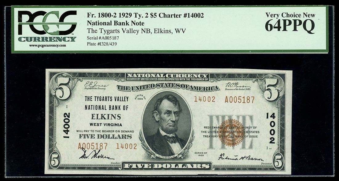 UNITED STATES, Tygarts Valley National Bank of Elkins, West Virginia, $5 National Bank Note, series of 1929, serial A005187, Jones-Mooney, Ch. #14002, rare, PCGS Currency Very Choice New 64 PPQ. Fr-1800-2. Built along the Tygart Valley River, the small town of Elkins, West Virginia, is the county seat of Randolph County and has a population around 6,950. Nationals from this bank are very rare in any grade. This choice note is decently centered with a bold, well-printed design and great paper quality.