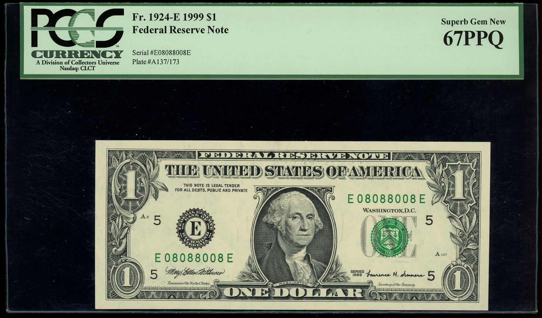 UNITED STATES, Washington, D.C., $1 Federal Reserve Note, series 1999, serial E08088008E, Withrow-Summers, PCGS Currency Gem New 67 PPQ. Fr-1924-E. Several 8s are featured in the serial number of this very nice Gem note.