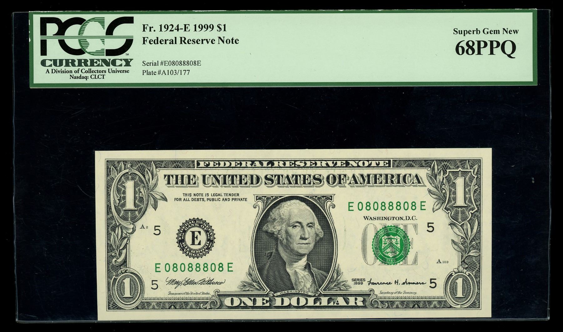 UNITED STATES, Washington, D.C., $1 Federal Reserve Note, series 1999, serial E08088808E, Withrow-Summers, PCGS Currency Gem New 68 PPQ. Fr-1924-E. A Superb Gem $1 note featuring several 8s in its serial number.