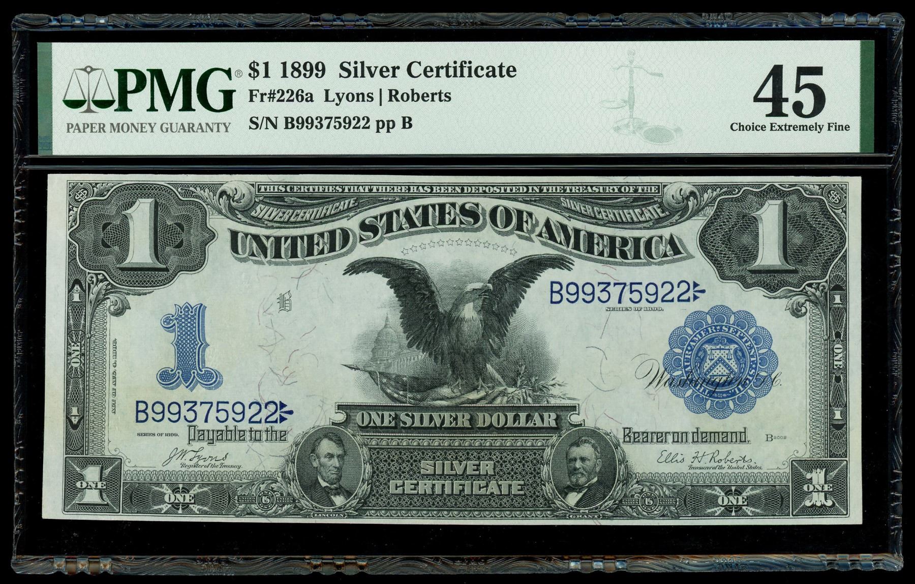 UNITED STATES, Washington, D.C., $1 Silver Certificate, series of 1899, serial B99375922, Lyons-Roberts, PMG Choice XF 45. Fr-226a. Nice, lightly handled note with bright paper and bold inking.
