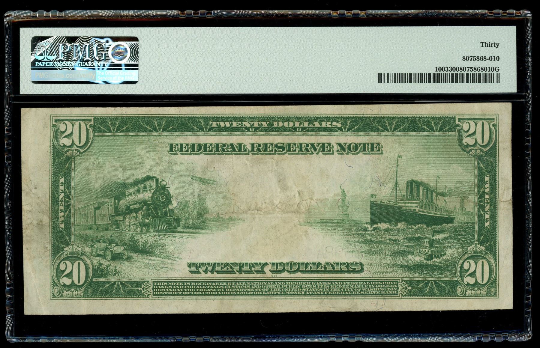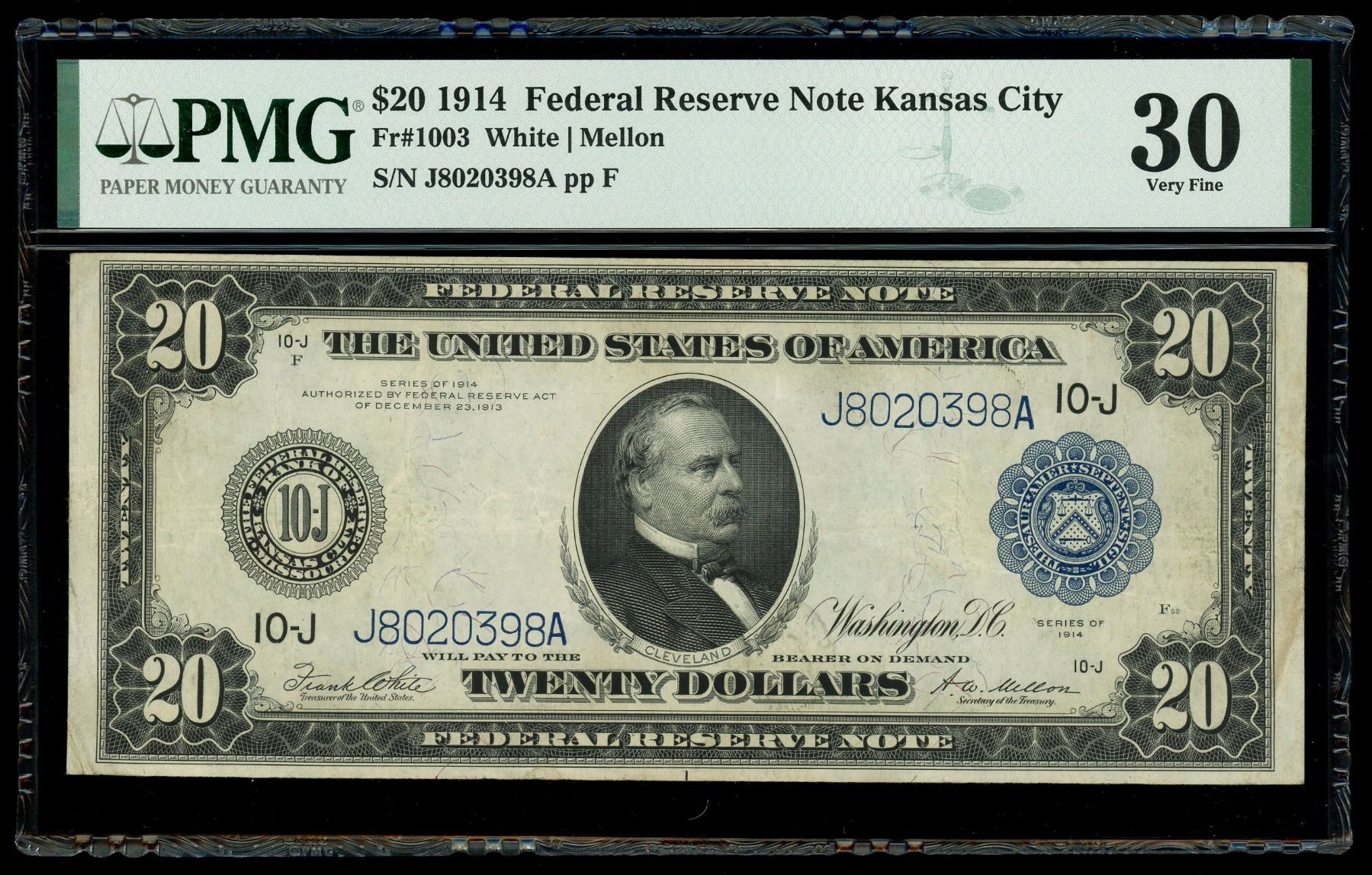UNITED STATES, Washington, D.C., $20 Federal Reserve note, series of 1914, serial J8020398A, White-Mellon, PMG VF 30. Fr-1003. Circulated note with some minor soiling, otherwise bold ink design.
