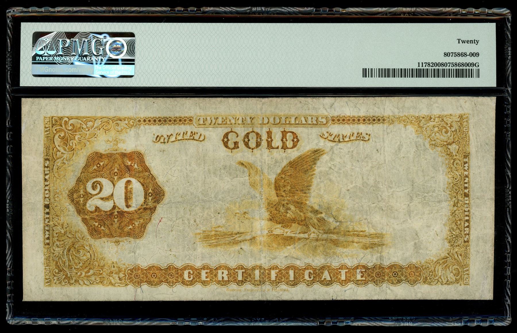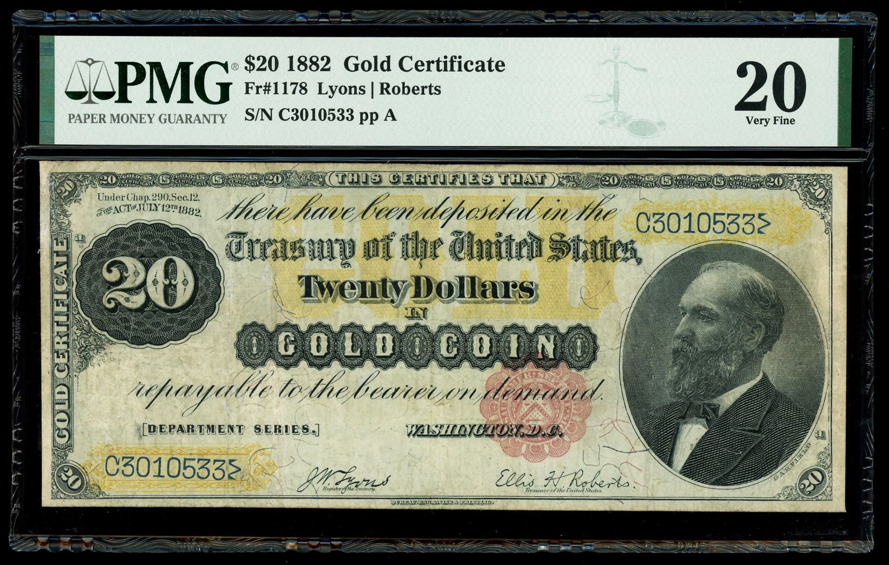 UNITED STATES, Washington, D.C., $20 Gold Certificate, 1882, serial C3010533, Lyons-Roberts, PMG VF 20. Fr-1178. The bust of President James Garfield, killed just a year prior in 1881, features prominently on this $20 gold certificate. Nice, even margins and fairly bold face printing on this circulated note, some oxidation and ink fading on the back.