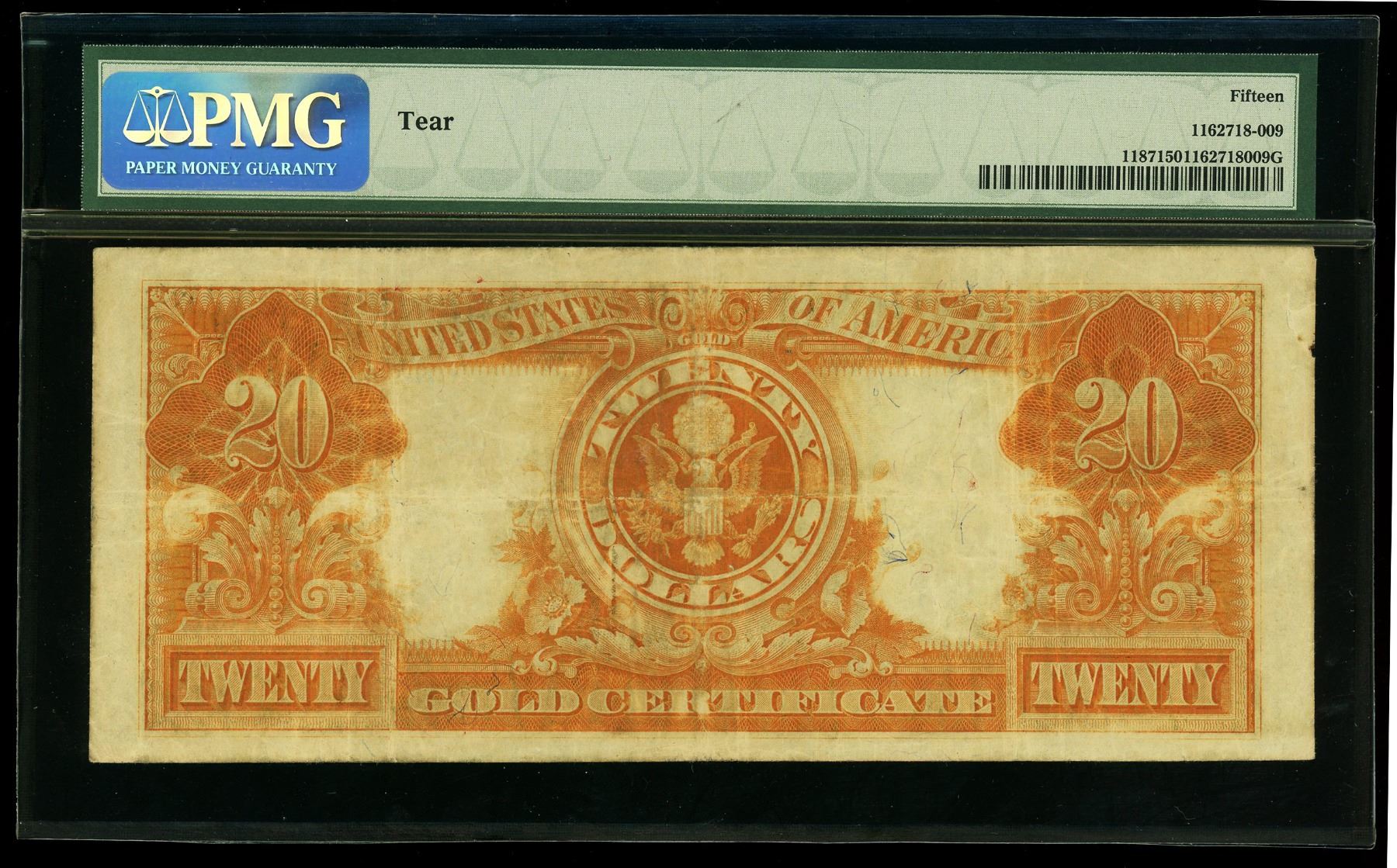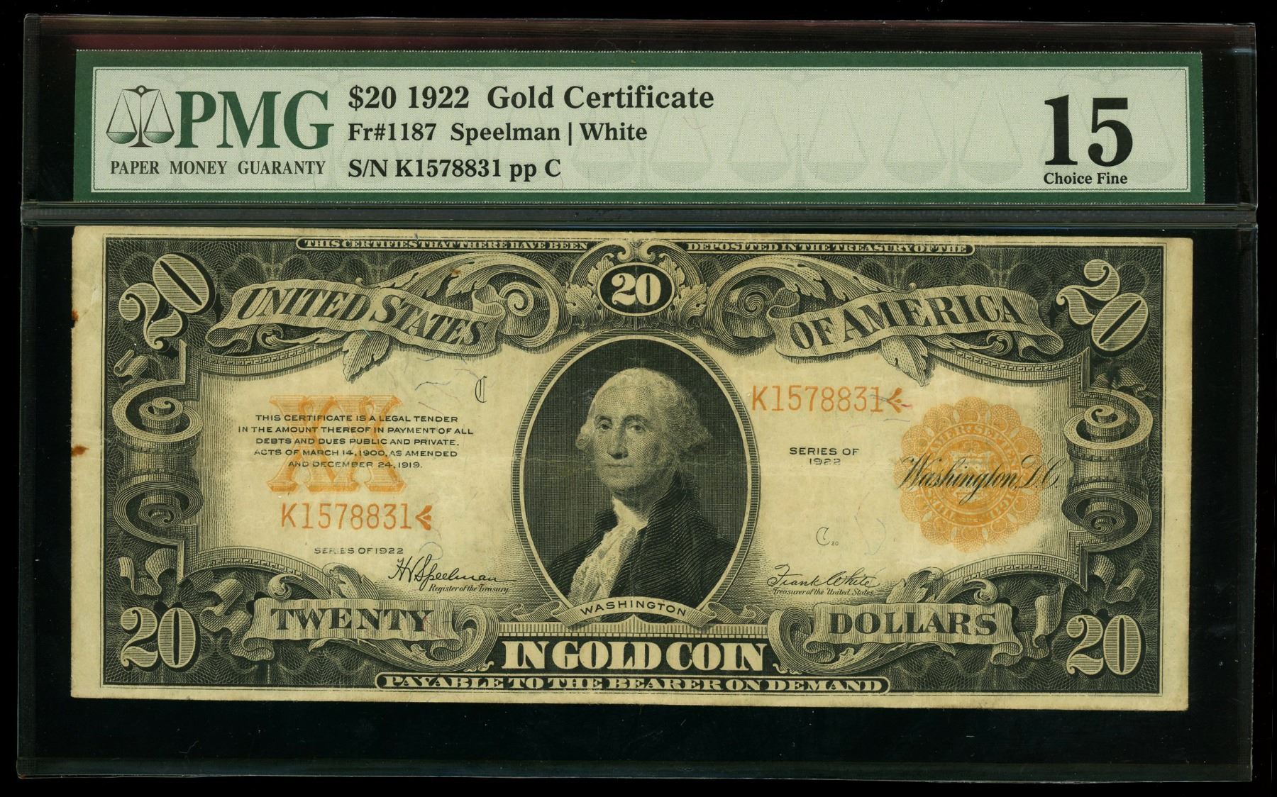 UNITED STATES, Washington, D.C., $20 Gold Certificate, series of 1922, serial K1578831, Speelman-White, PMG Choice F 15, ex-Busto. Fr-1187. Boldly printed note, circulated with small tear and rust stains on the left margin, pair of pinholes above the Washington vignette. Note that the PMG holder does exhibit some yellowing. Pedigreed to the José Busto Collection.