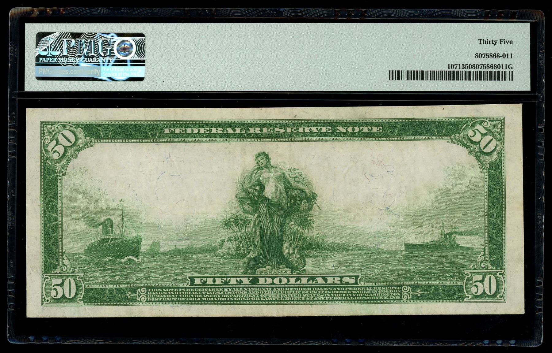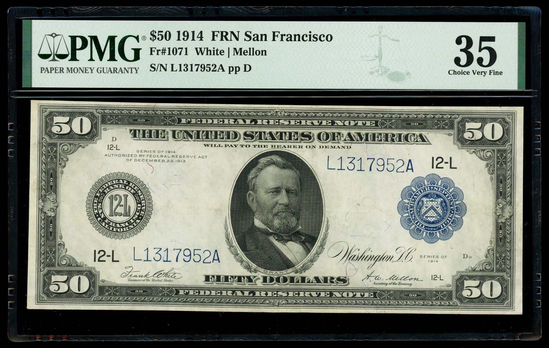 UNITED STATES, Washington, D.C., $50 Federal Reserve note, series of 1914, L1317952A, White-Mellon, PMG Choice VF 35. Fr-1071. Nice example of this large size $50 with bold ink colors, even margins, and bright paper quality, quite choice for the grade.