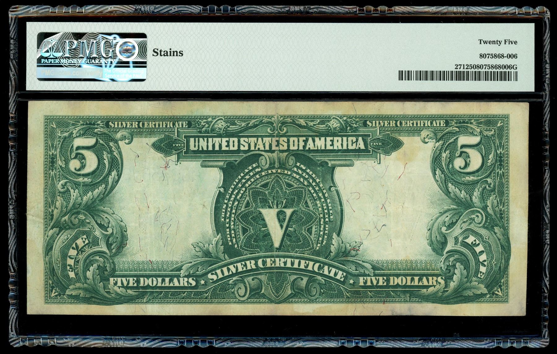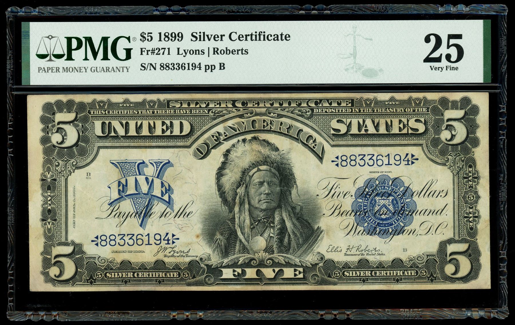 UNITED STATES, Washington, D.C., "Chief" $5 Silver Certificate, series of 1899, serial 8833619, Lyons-Roberts, PMG VF 25. Fr-271. Circulated example of the ever-popular "Chief" silver certificate with bold ink colors on both sides and nice margins, light stains around the edges as noted on PMG holder.
