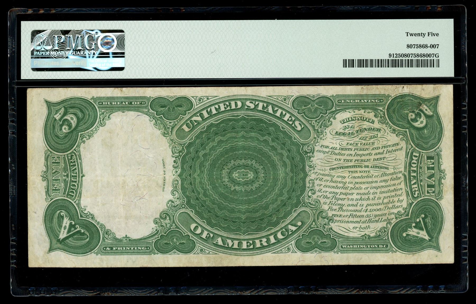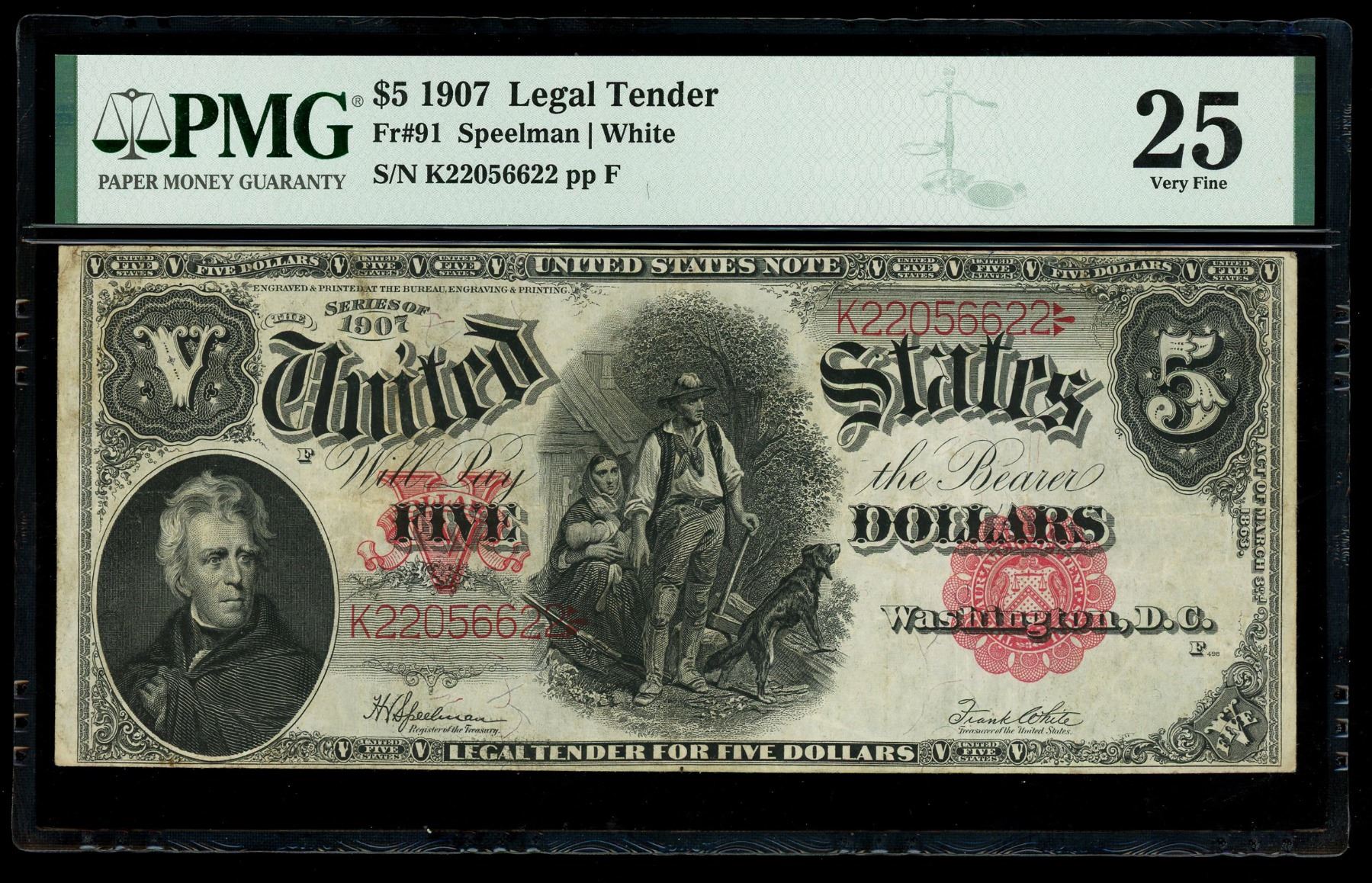 UNITED STATES, Washington, D.C., "Woodchopper" $5 Legal Tender note, series of 1907, serial K22056622, Speelman-White, PMG VF 25. Fr-91. Nice example of a "Woodchopper" $5 with bold black and red ink colors, decent margins, and nice paper quality.