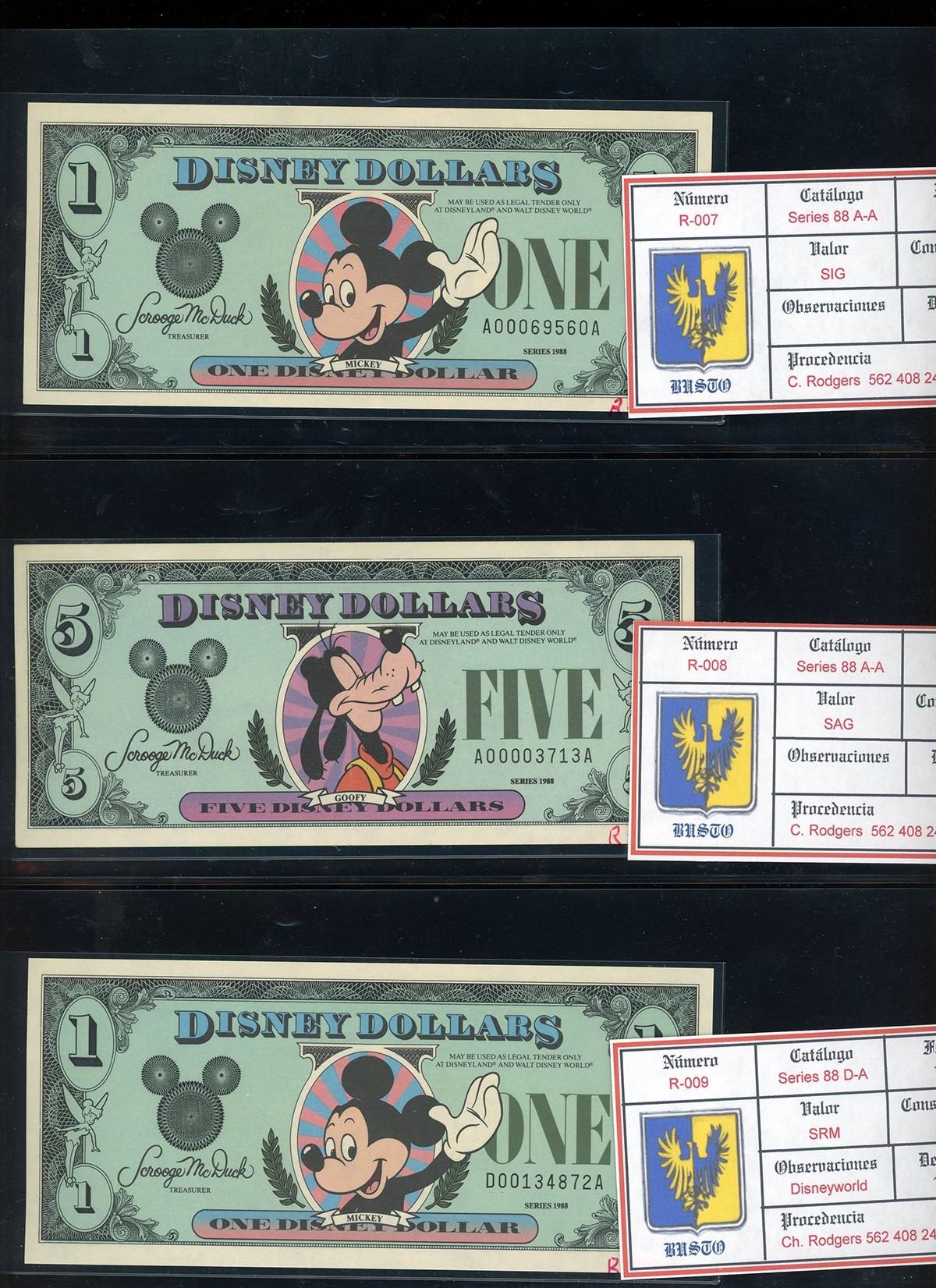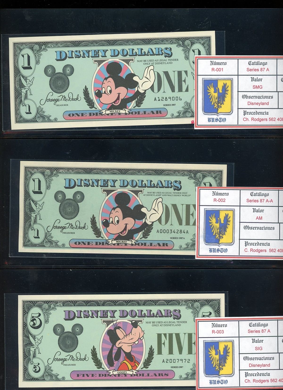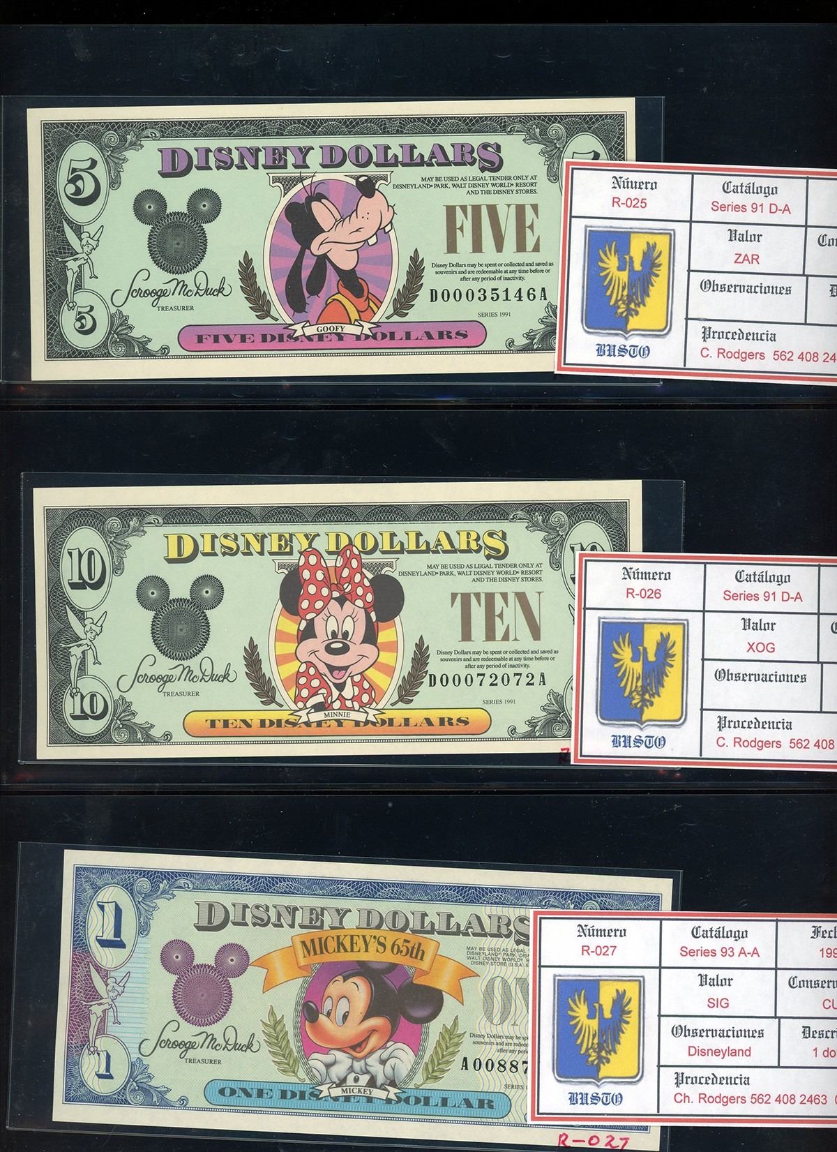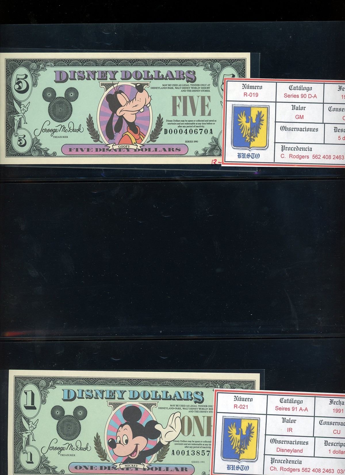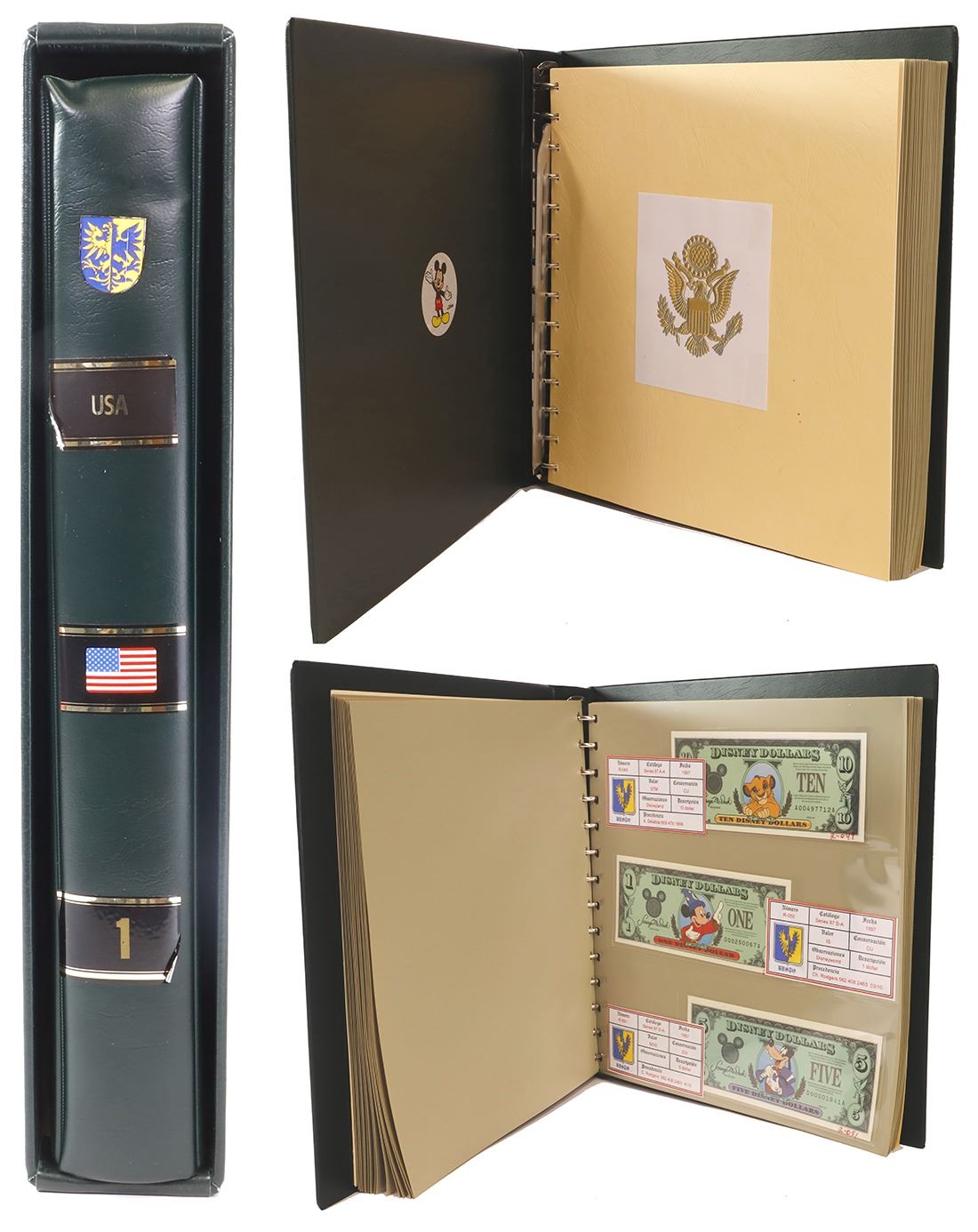 UNITED STATES, binder of Disney dollars (1987-2005), ex-Busto. Rodgers-R-001 to R-096 (some gaps). Total: 78 notes. A fascinating collection of Disney dollars assembled and cataloged by Rodgers numbers beginning with the very first Disney dollar issued, the 1987 $1 featuring Mickey Mouse (Rodgers-R-001), and continuing through to the 2005 $1 featuring Dumbo (Rodgers-R-096). Although Disney stopped printing Disney dollars in 2016, these notes are all still redeemable at Disney's theme parks, though the immense popularity and collector market value far exceeds their face value. A few small gaps are noted but the vast majority of notes issued from 1987 to 2005 are represented along with prefix and commemorative varieties. All Choice UNC with accompanying collector's tag and stored in a professional binder and slipcase. Personal inspection highly recommended. Pedigreed to the José Busto Collection.