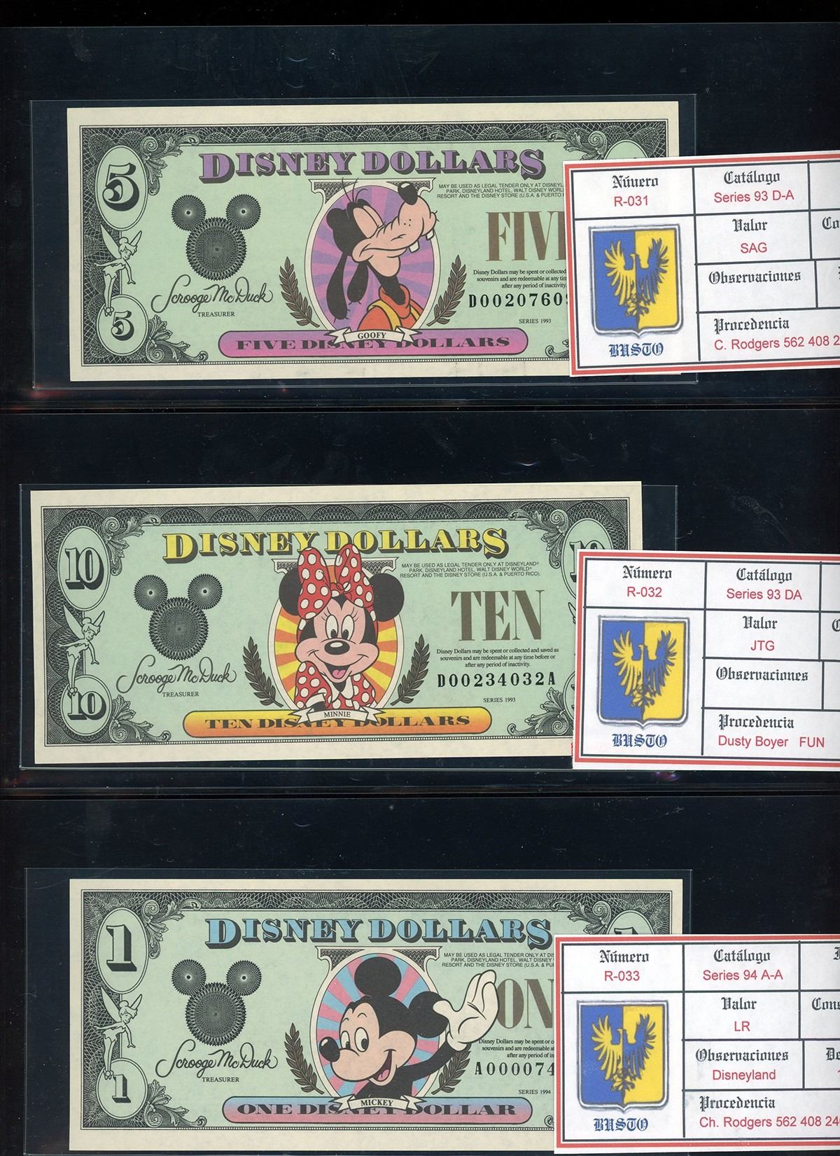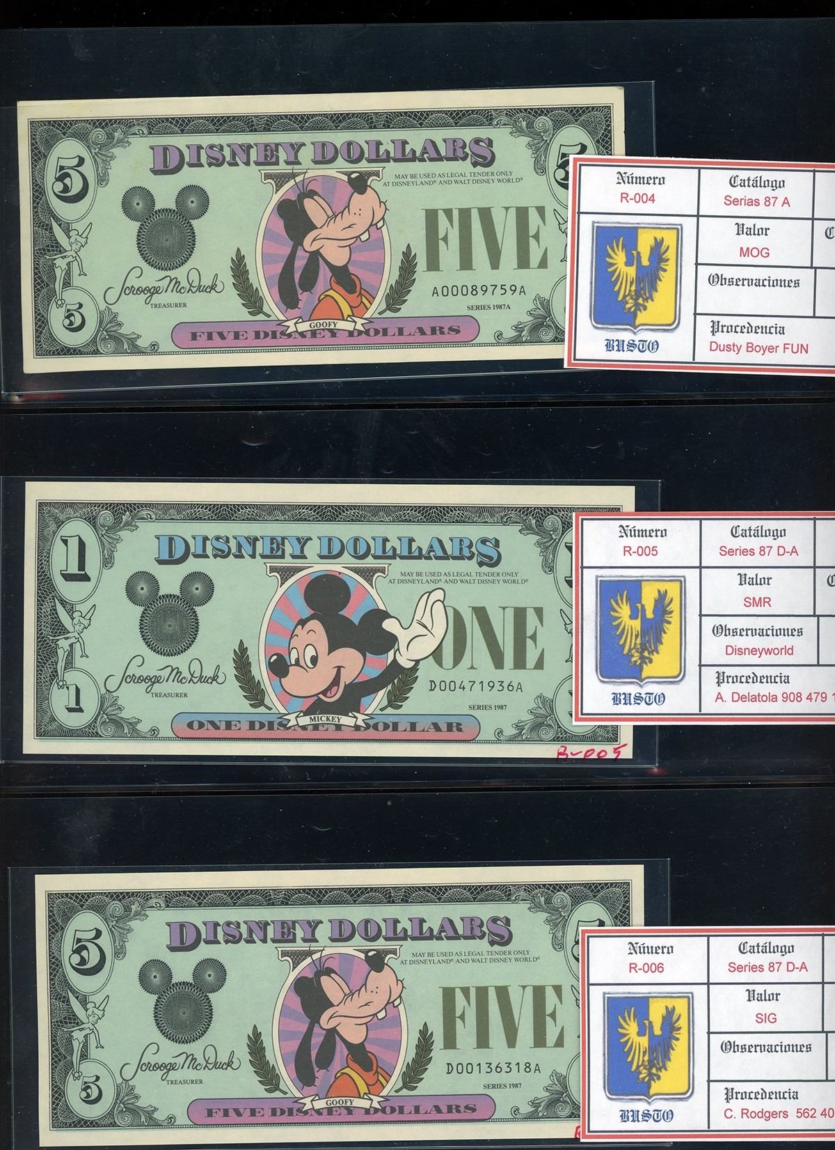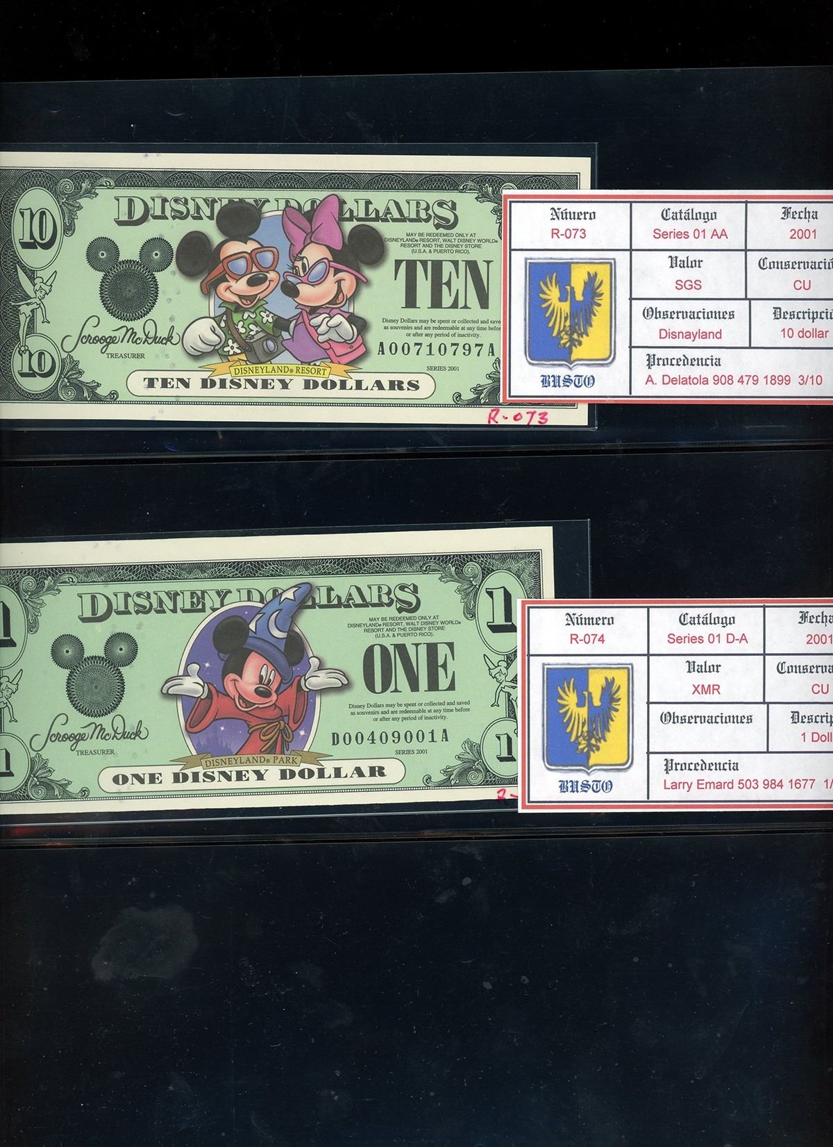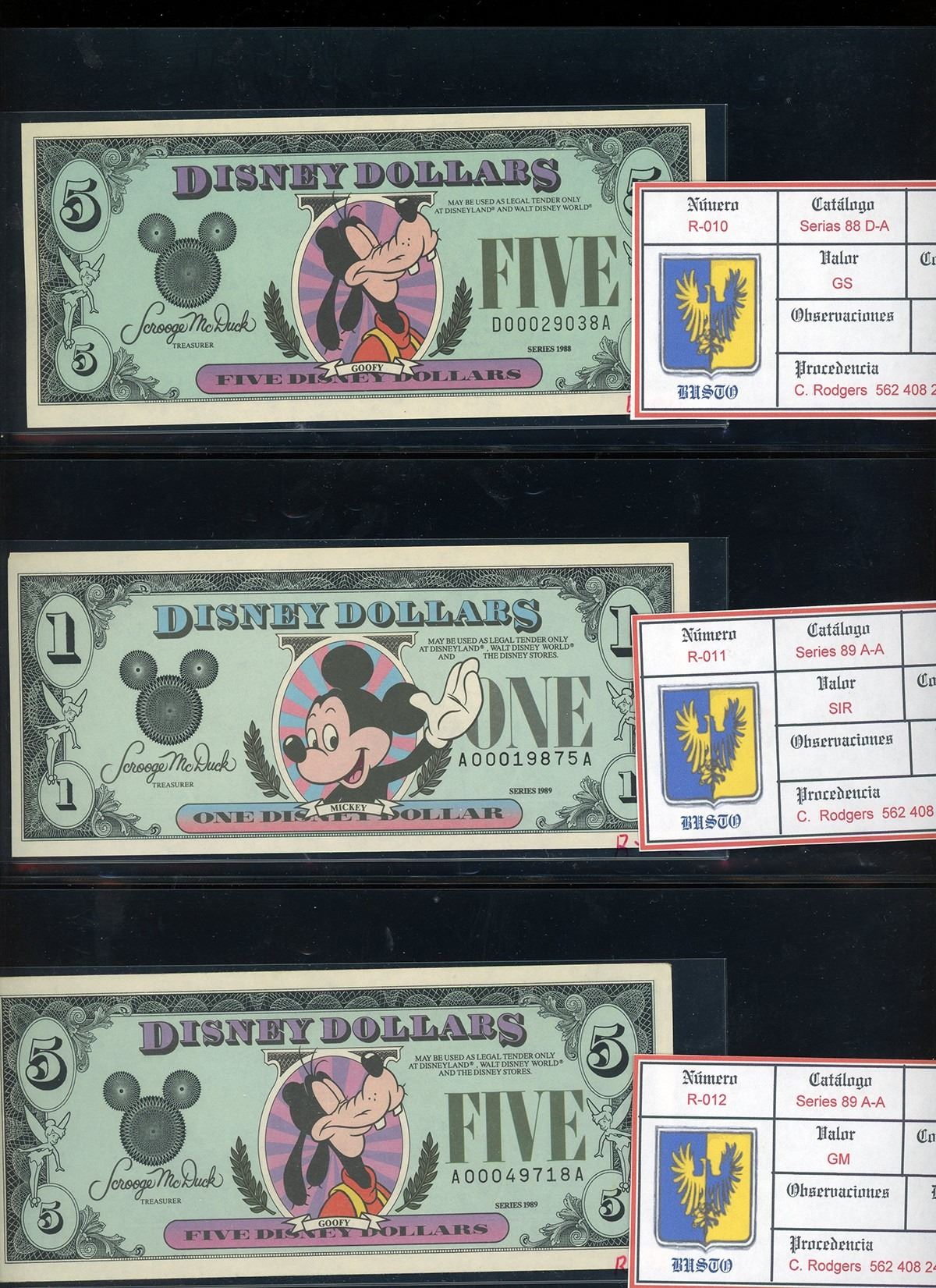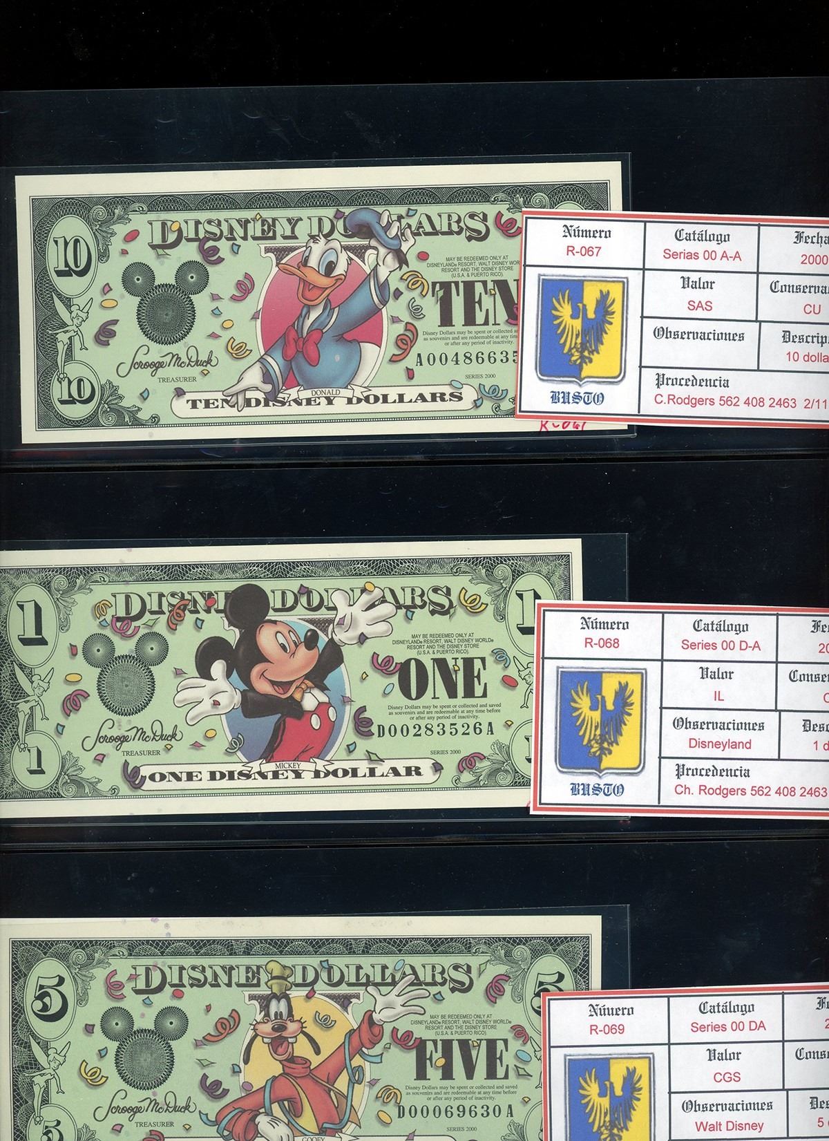 UNITED STATES, binder of Disney dollars (1987-2005), ex-Busto. Rodgers-R-001 to R-096 (some gaps). Total: 78 notes. A fascinating collection of Disney dollars assembled and cataloged by Rodgers numbers beginning with the very first Disney dollar issued, the 1987 $1 featuring Mickey Mouse (Rodgers-R-001), and continuing through to the 2005 $1 featuring Dumbo (Rodgers-R-096). Although Disney stopped printing Disney dollars in 2016, these notes are all still redeemable at Disney's theme parks, though the immense popularity and collector market value far exceeds their face value. A few small gaps are noted but the vast majority of notes issued from 1987 to 2005 are represented along with prefix and commemorative varieties. All Choice UNC with accompanying collector's tag and stored in a professional binder and slipcase. Personal inspection highly recommended. Pedigreed to the José Busto Collection.