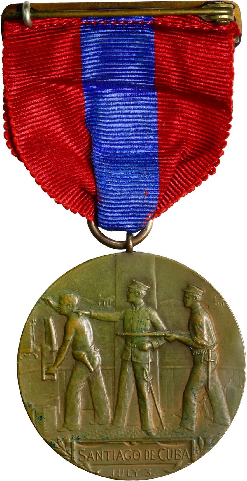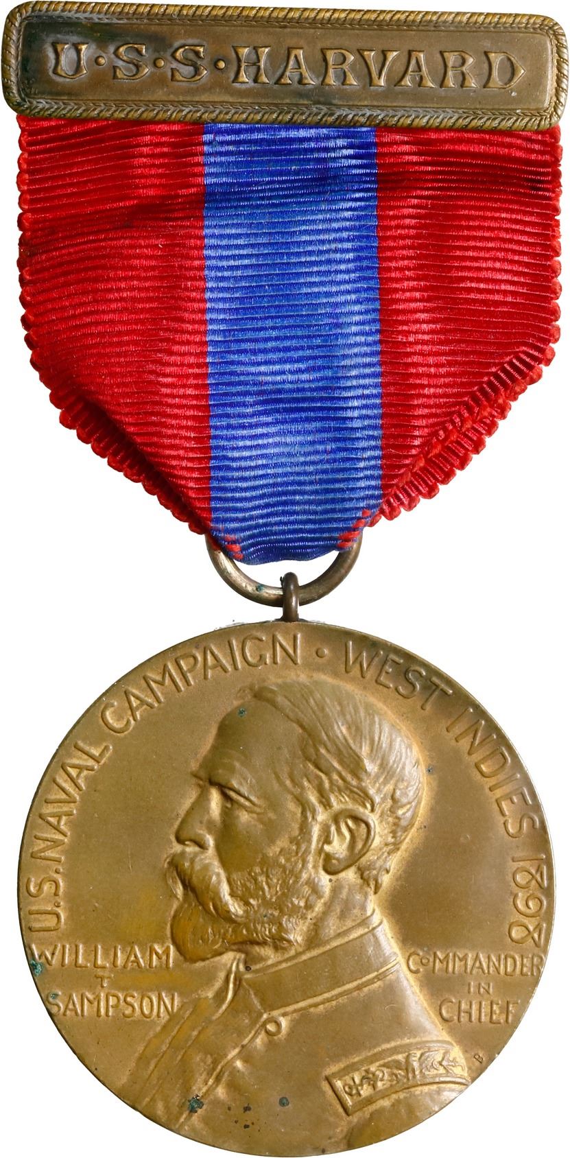 UNITED STATES, bronze Sampson medal, 1898, U.S Naval Campaign West Indies (Spanish-American War), awarded to Ordinary Seaman William H. Sutter of the cruiser USS Harvard. 36.04 grams total. William Henry Sutter is confirmed on the crew roster as serving as an Ordinary Seaman aboard the USS Harvard. The auxiliary cruiser USS Harvard is notable as having rescued over 600 Spanish sailors from the burning and scuttled Spanish ships in the aftermath of the Battle of Santiago. Boldly struck medal with some red luster highlights around the details, reverse with verdigris, clear impressed name on rim, original ribbon attached to bar hanger brooch with USS HARVARD named on it.