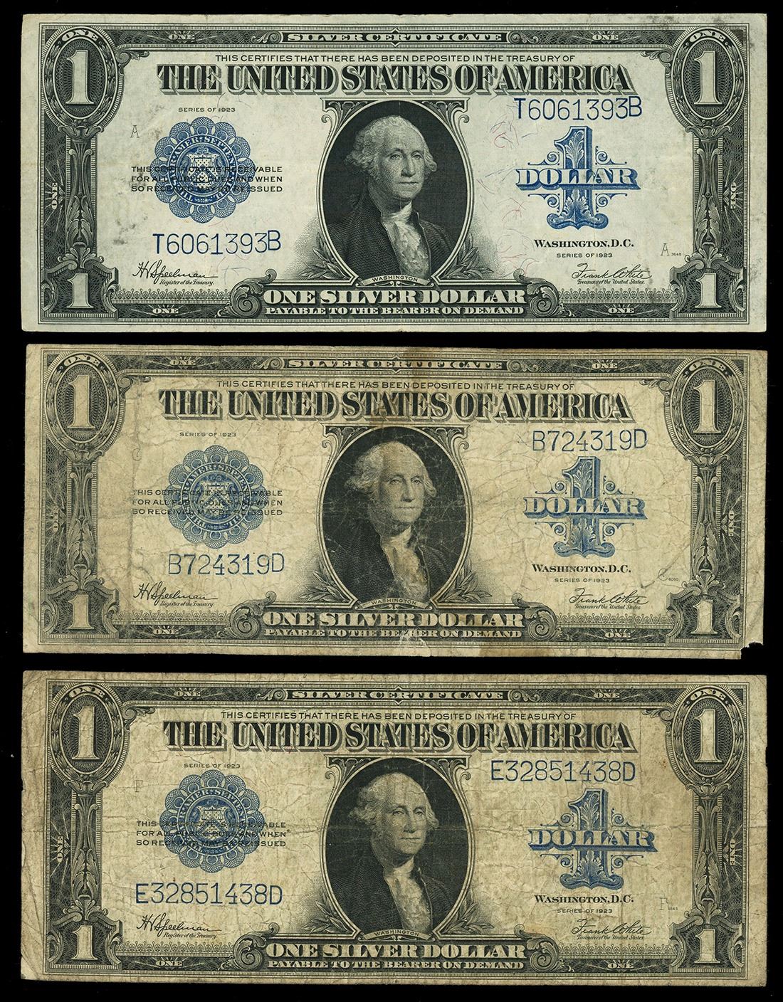 UNITED STATES, lot of three $1 Silver Certificates, series of 1923, Speelman-White.