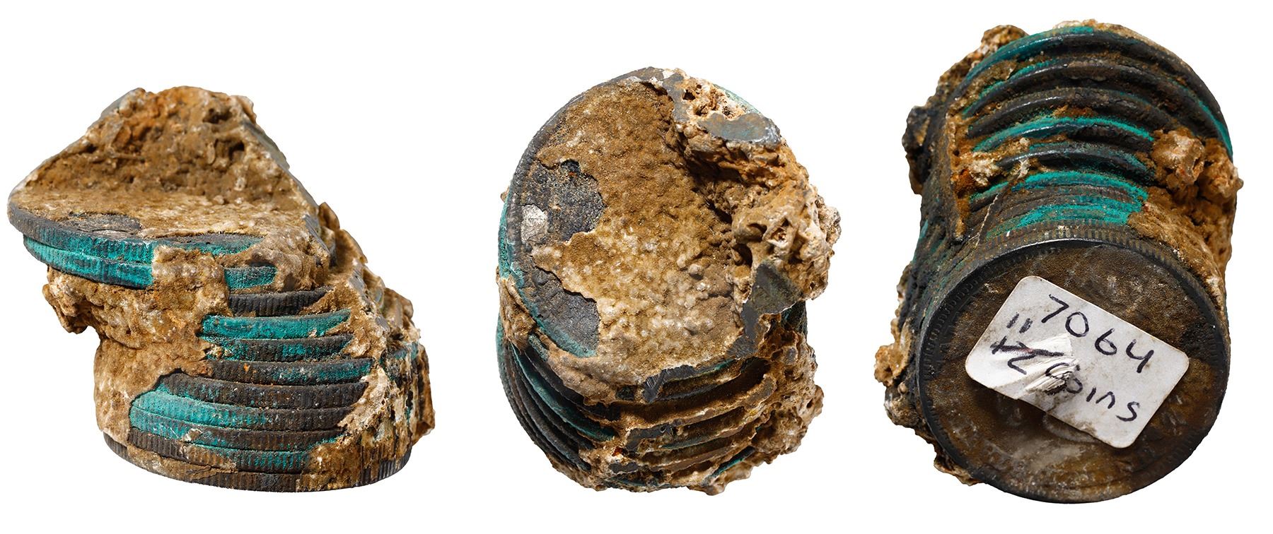 UNITED STATES, mints uncertain, clump of eleven seated Liberty half dollars, dates not visible, very rare. 141.76 grams total. Tightly encrusted leaning stack of half dollars from the SS Republic with bits of sediment, rocks, and verdigris scattered about its surfaces, one end showing its eagle on the reverse through its encrustation. Note: The certificate says the clump contains twelve coins in error. With certificate. Recovered from: S.S. Republic, sunk in 1865 off Georgia