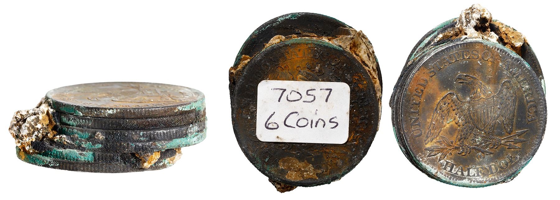 UNITED STATES, mints uncertain, clump of six seated Liberty half dollars, dates not visible (one 1861-O Confederate-struck with Speared Olive Bud variety), very rare. 75.32 grams total. Uncleaned clumps from the SS Republic are already rare but this particular clump offers up something special: One of the end coins on this leaning stack shows a distinctive speared olive bud reverse which is only seen on the 1861-O halves struck by the Confederate States! While dark and encrusted, that coin's sharp design details show through just enough to identify it as a Confederate-struck half minted in March or April of 1861. We've offered a few clumps from the SS Republic over the years but this is a first to have one that has a clear Confederate half included. The other coins in the stack are tightly stuck together with the other end-coin also showing its reverse though it bears a bit more encrustation and rust spots. Excellent opportunity for the serious SS Republic collector. With certificate. Recovered from: S.S. Republic, sunk in 1865 off Georgia