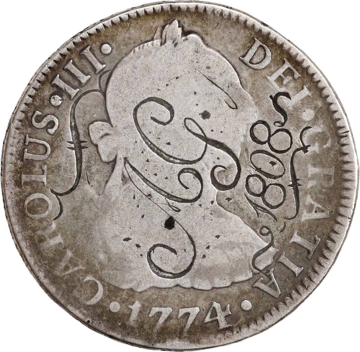 UNITED STATES, "two bit" love token, engraved script AG above 1808 date on a Mexico City, Mexico, bust 2 reales, Charles III, 1774 FM. Yonaka-M2.74; Cal-660; KM-88.2. 6.51 grams. Well-executed engraving with many flourishes on this richly toned Fine host coin.