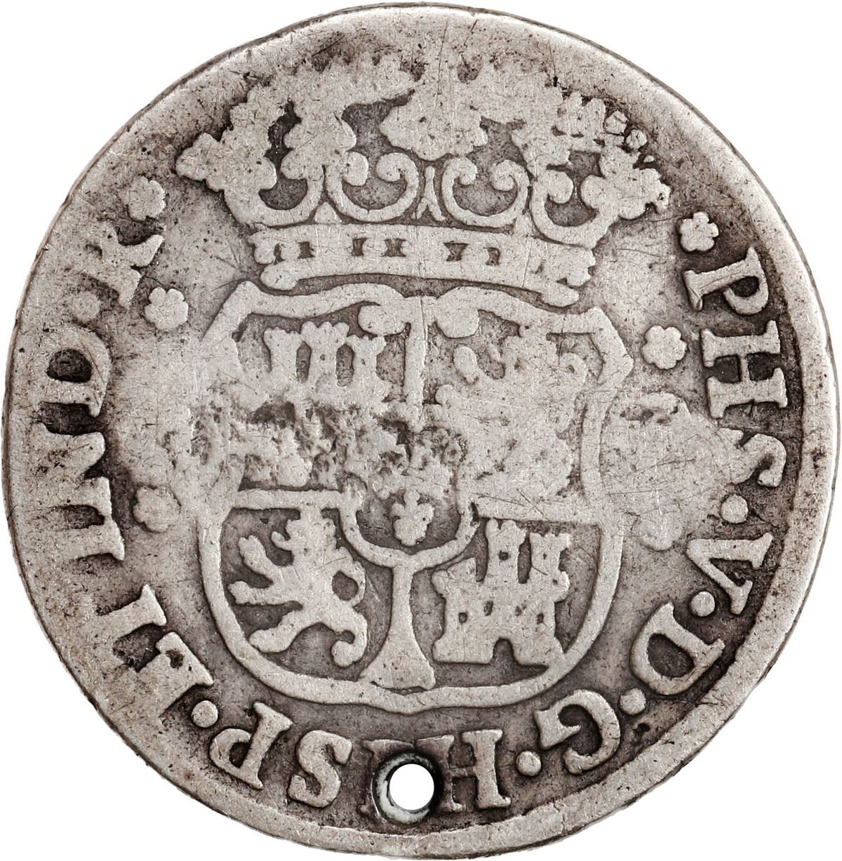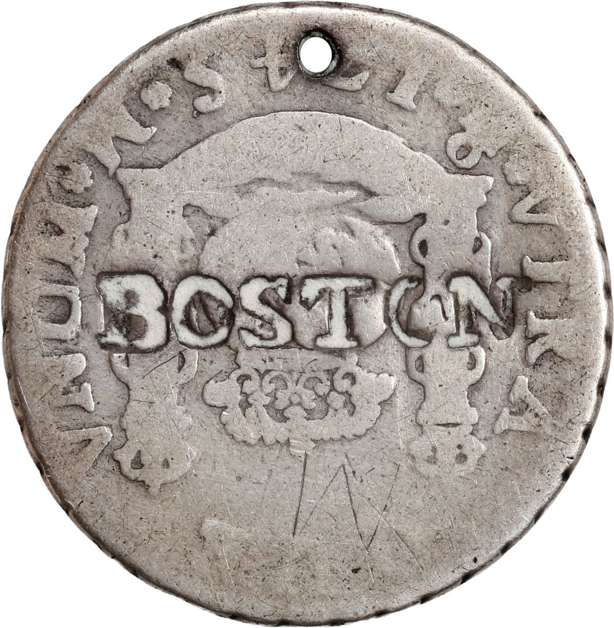 UNITED STATES, "two bit" token, countermark BOSTON on a Mexico City, Mexico, pillar 2 reales, Philip V, 1745 M. Yonaka-M2.45; Gilboy-M-2-17; KM-85; Cal-833 (host coin). 6.10 grams. Bold BOSTON countermark across the pillars side of this VG host coin, which is not documented in Brunk. Brunk notes that the BOSTON countermark appears to be the name of a person or firm rather than for the city; he offers the Boston Type and Stereotype factory as its possible origin. Holed at date, a little graffiti above the crown.