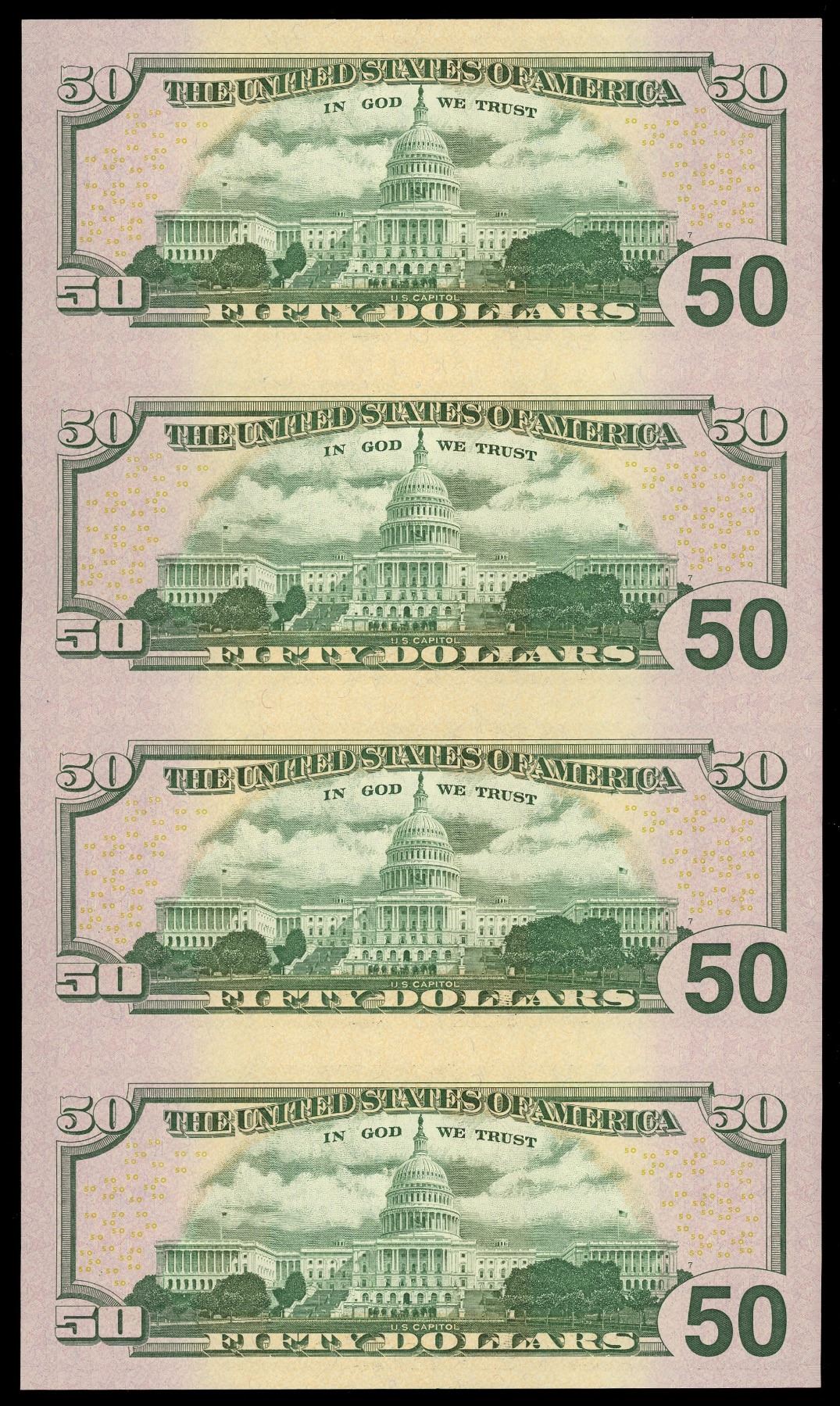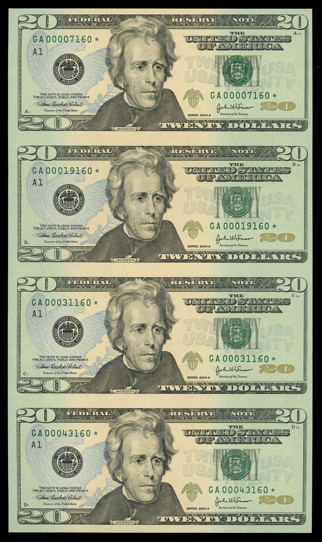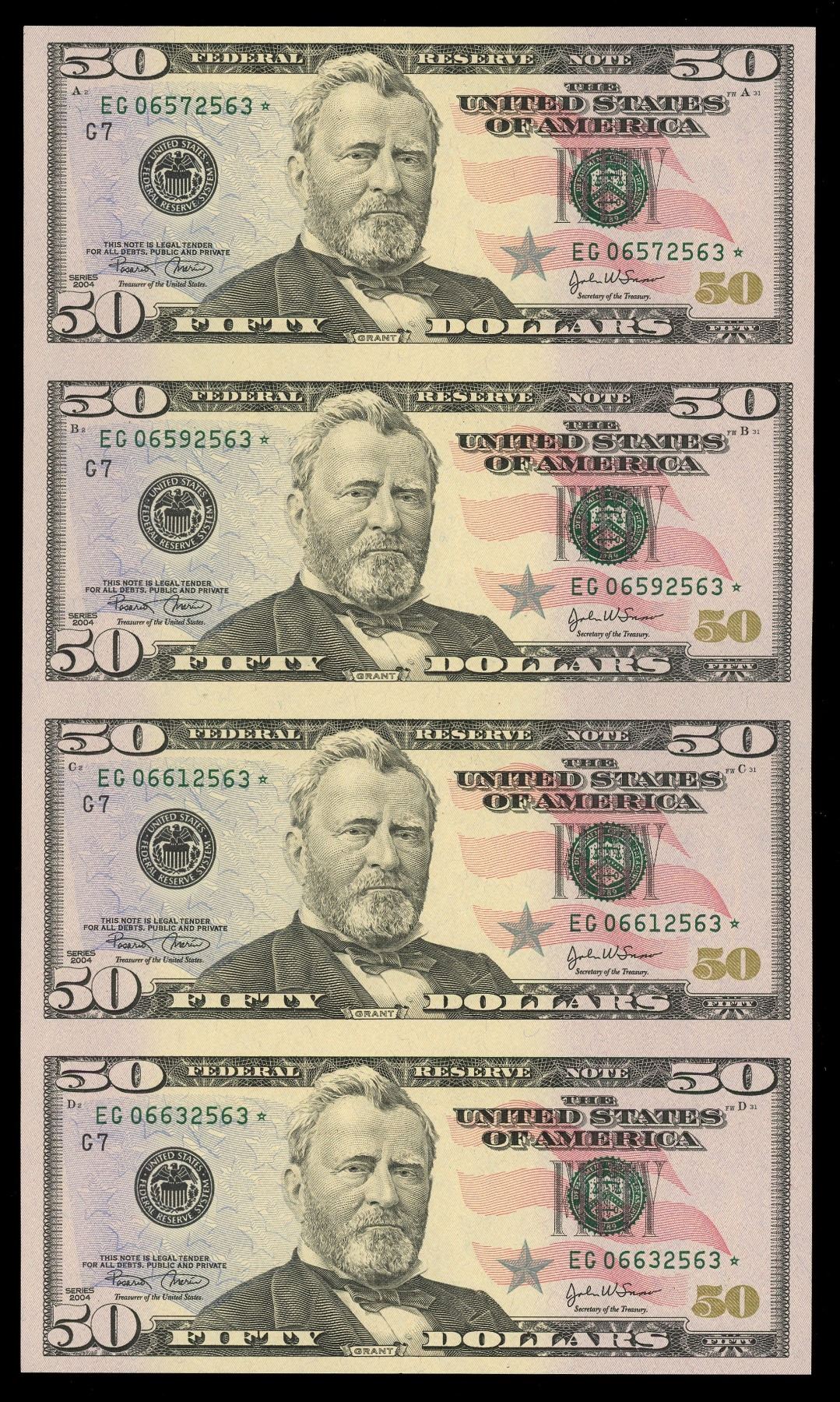 UNITED STATES, two uncut star note sheets: series 2004 $50 and series 2004A $20.