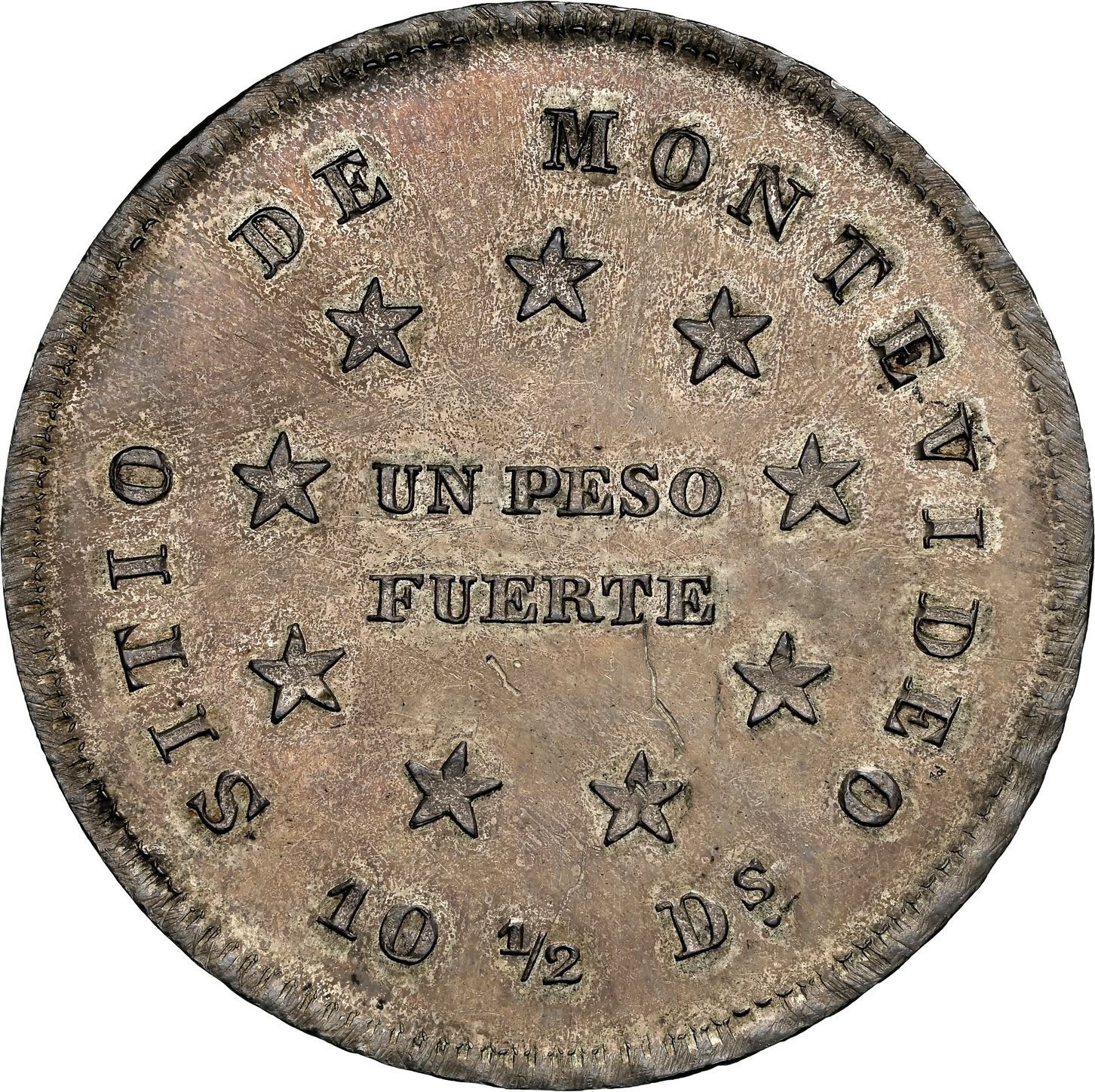 URUGUAY, Montevideo, 1 peso fuerte, 1844, medal alignment, rare, NGC MS 62. KM-5. Choice luster with speckled gray toning, nice strike and full rims, just a few light marks on reverse, a high-grade example of the rare "Peso del Sitio" or "Montevideo Siege Peso" struck in low mintage (only 1500 pieces) in February 1844 during the nearly eight-year Siege of Montevideo (described by the famous French writer Alexandre Dumas as a "new Troy") by Manuel Oribe, who, in alliance with General Rosas of Argentina, had formed his own government outside the city during the Uruguayan Civil War, the siege finally ending upon the defeat of Oribe by Brazilian troops in 1851.