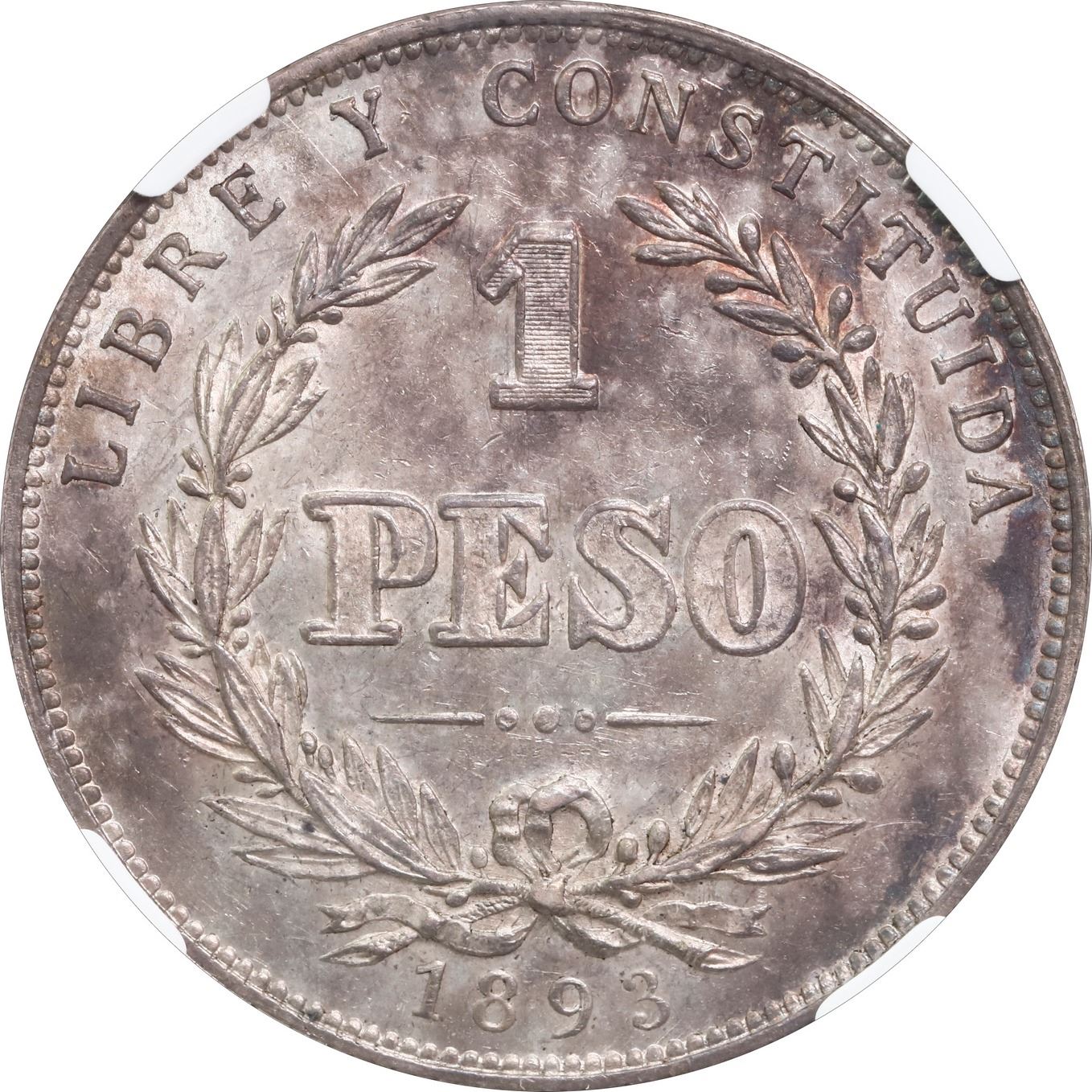 URUGUAY, struck in Buenos Aires, 1 peso, 1893, round-top 3, NGC MS 63. KM-17a. Beautifully lustrous with splashes of deep rainbow toning, faint old hairlines and bagmarks on reverse, choice grade.