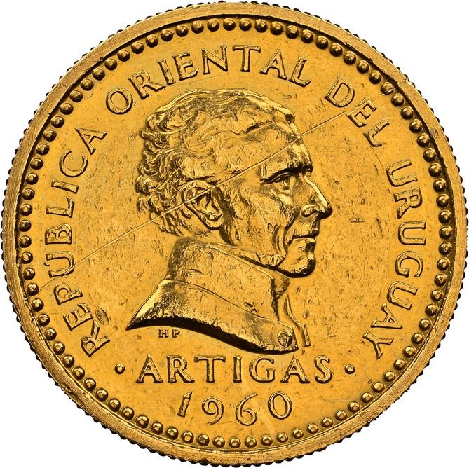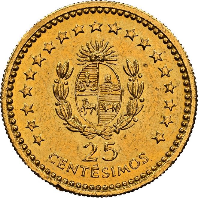 URUGUAY, struck in London, gold off-metal proof pattern 25 centésimos, 1960, Artigas, NGC Proof deta