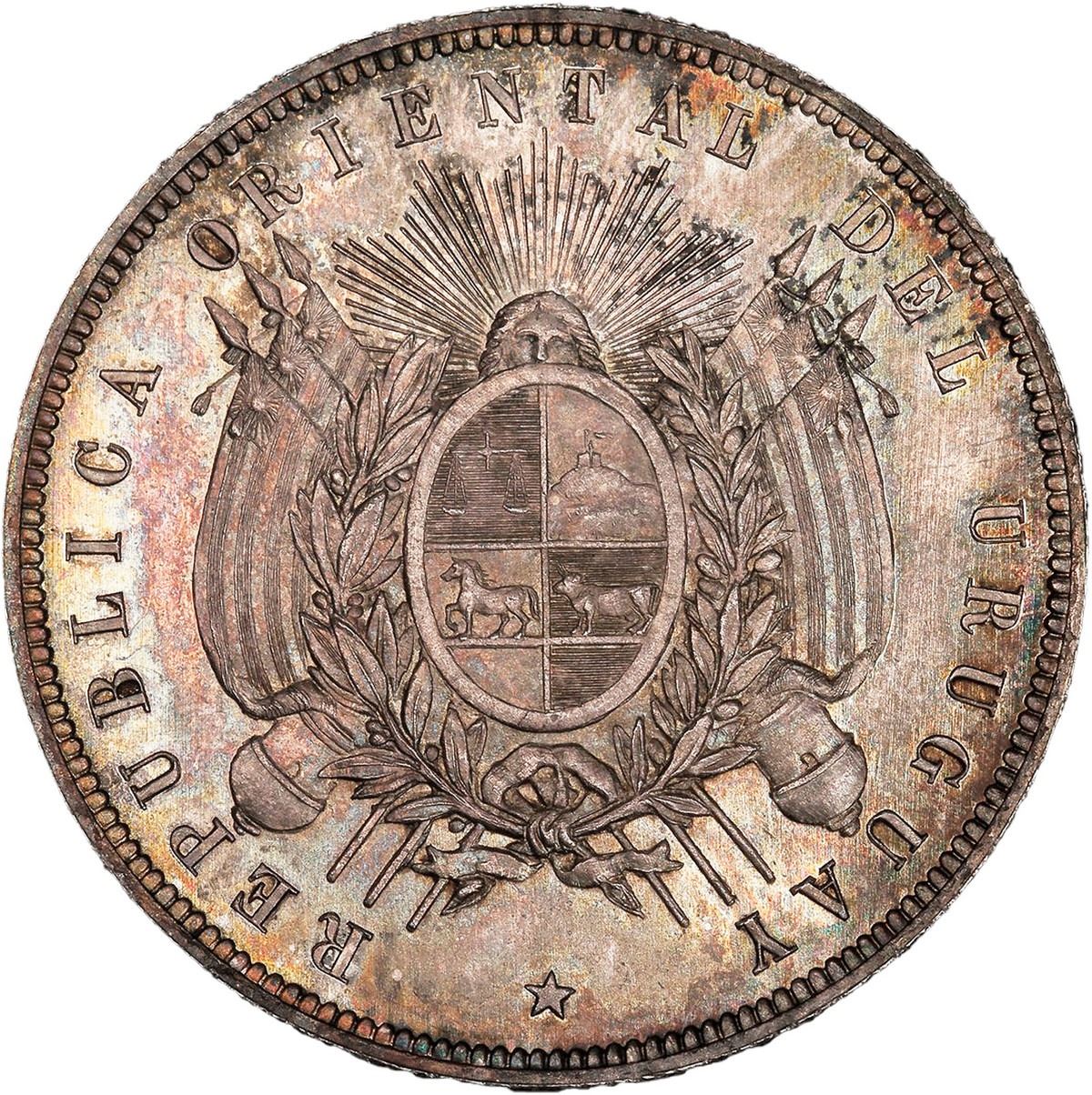 URUGUAY, struck in Paris, 1 peso, 1877-A, PCGS MS66, "top pop," ex-Huntington (stated on label). KM-17. Strong luster overlain with vivid rainbow toning for maximum eye appeal, choice gem grade (tied with one other for finest in the PCGS census, just two finer at NGC), with desirable pedigree, a showpiece for the high-end Latin American crown collector. Pedigreed to the A.M. Huntington Collection (Morton & Eden auction of March 2013, lot 537).