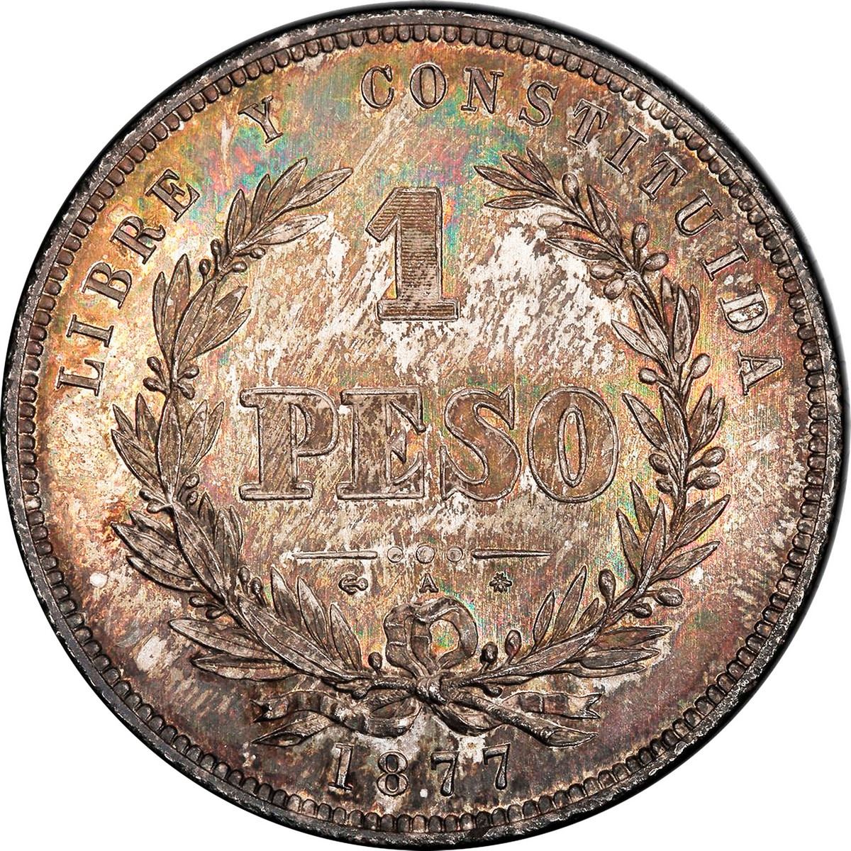URUGUAY, struck in Paris, 1 peso, 1877-A, PCGS MS66,  top pop,  ex-Huntington (stated on label).