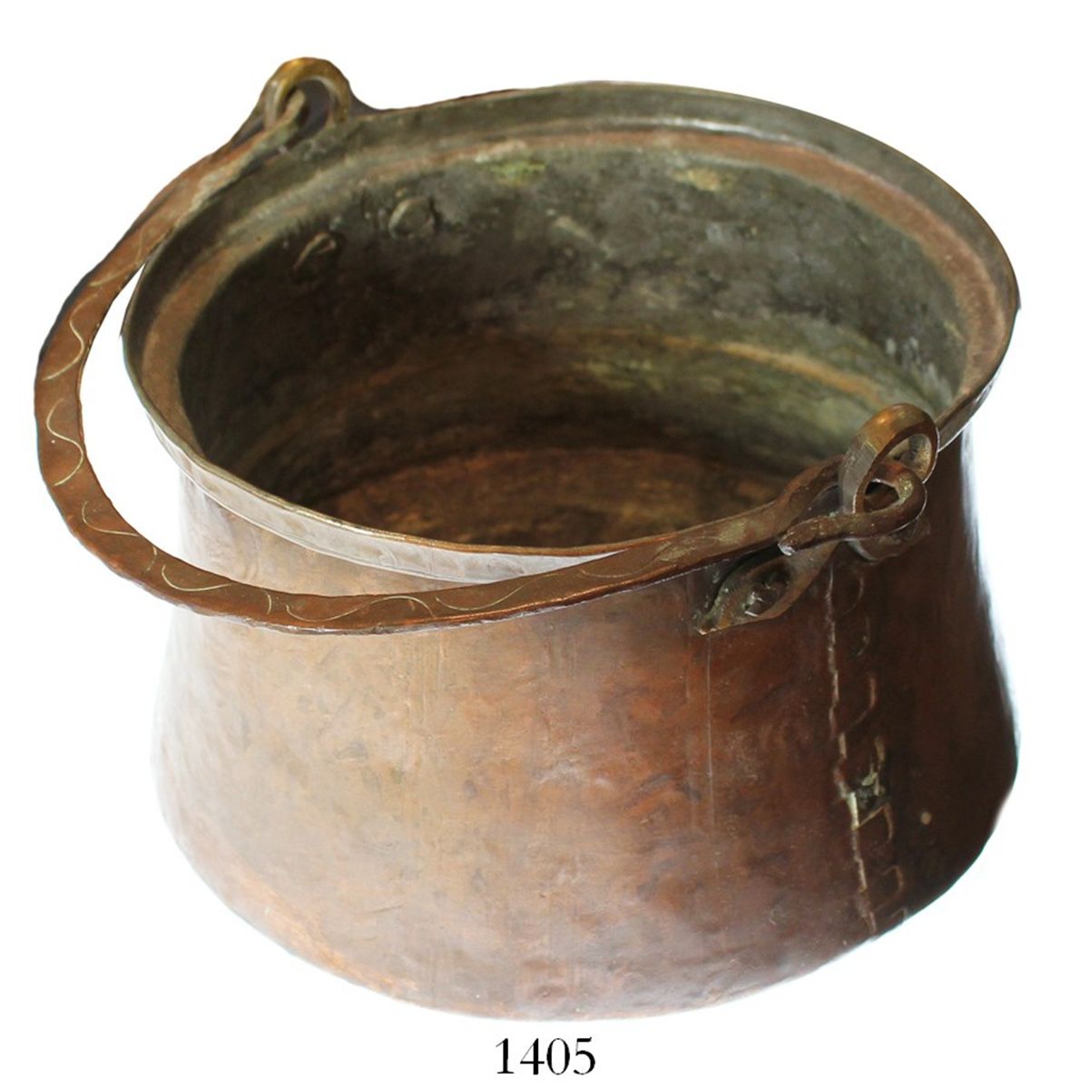 US colonial-era copper pot with stitched bottom, late 1700s. 801 grams, about 5" tall and 8" in diameter. Well-used and obviously aged but fully intact and functional, with engraved handle attached to simple loops below rim, with two side seams and seam at bottom displaying a characteristic "stitching," bright copper exterior and dull tin interior.