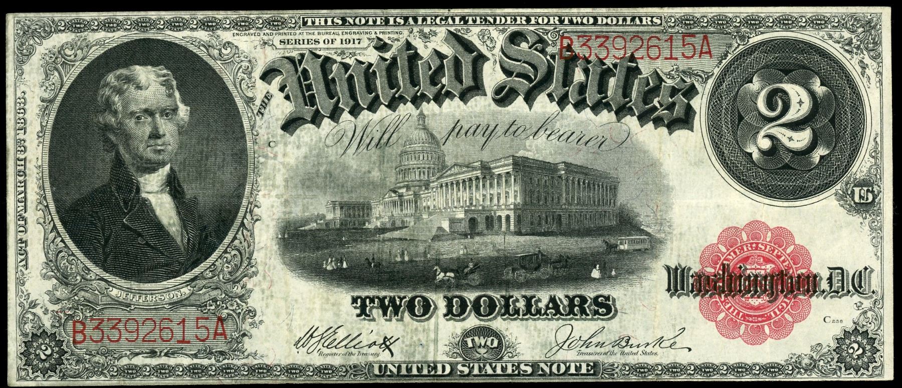 USA, $2 legal tender note, series of 1917, serial B3392615A, Elliott-Burke.