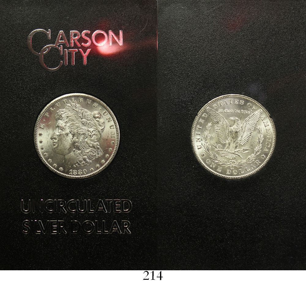 USA (Carson City mint), $1 Morgan, 1880-CC, in original GSA plastic holder and box and with original card (numbered). KM-110. About 4-3/8" x 6-1/2". Frosty Mint State with bagmarks, popular original packaging.