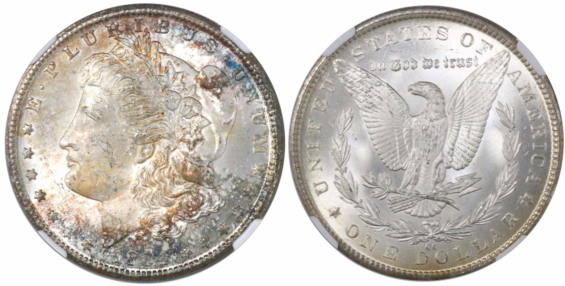 USA (Carson City mint), $1 Morgan, 1884-CC, encapsulated NGC MS 64. KM-110. Obverse flecked with blue, red and yellow toning, reverse with a satiny white look. NGC #2564940-009.