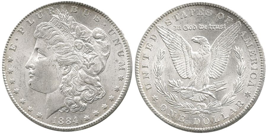 USA (Carson City mint), 1 dollar Morgan, 1884-CC. KM-110. 26.7 grams. Frosty UNC with minor bagmarks, decent luster, probably MS 62 but no guarantee.