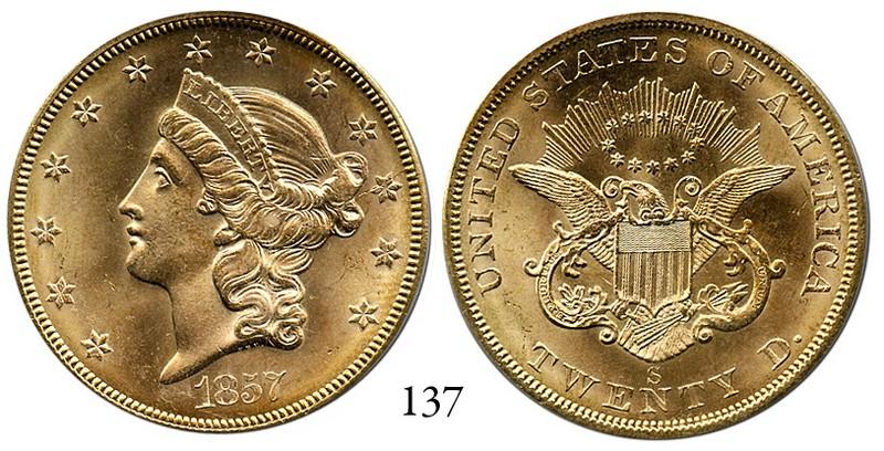 USA, Coronet $20, 1857-S, encapsulated PCGS MS-65 (20A Spiked Shield), from the SS Central America (