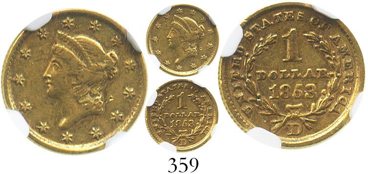 USA (Dahlonega mint), $1 Liberty head (Type 1), 1853-D, encapsulated NGC AU 50. KM-73. Bold strike but typically weak in the hair over the ear, nice toning and hint of luster.