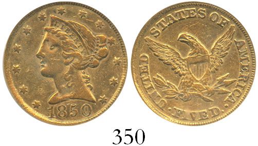 USA (Dahlonega mint), $5 (half eagle) coronet Liberty, 1850-D weak D, encapsulated PCGS XF45. KM-69. Deeply red-toned and with a hint of original luster among the usual marks for the grade.