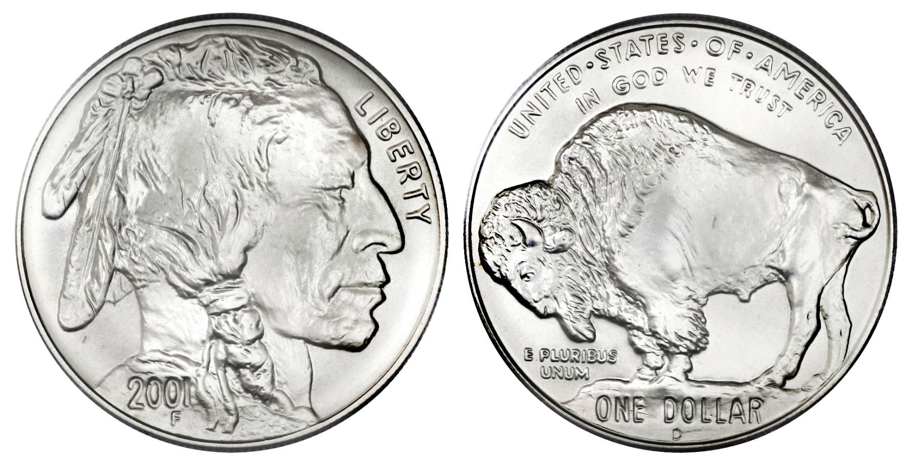 USA (Denver mint), $1 Buffalo, 2001-D, PCGS MS70. Finest grade possible for this classic coin design revived as a commemorative silver dollar, satiny lustrous surfaces. PCGS #80492335.