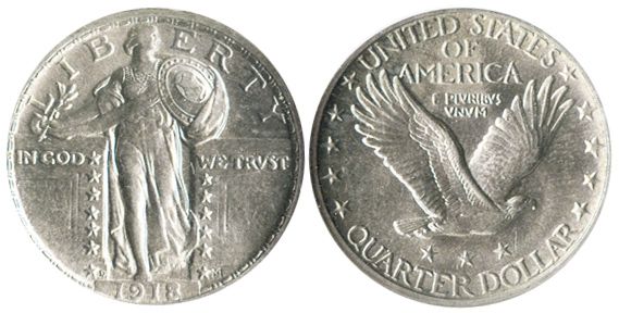 USA (Denver mint), 25 cents standing Liberty quarter, 1918-D, encapsulated PCI AU58.