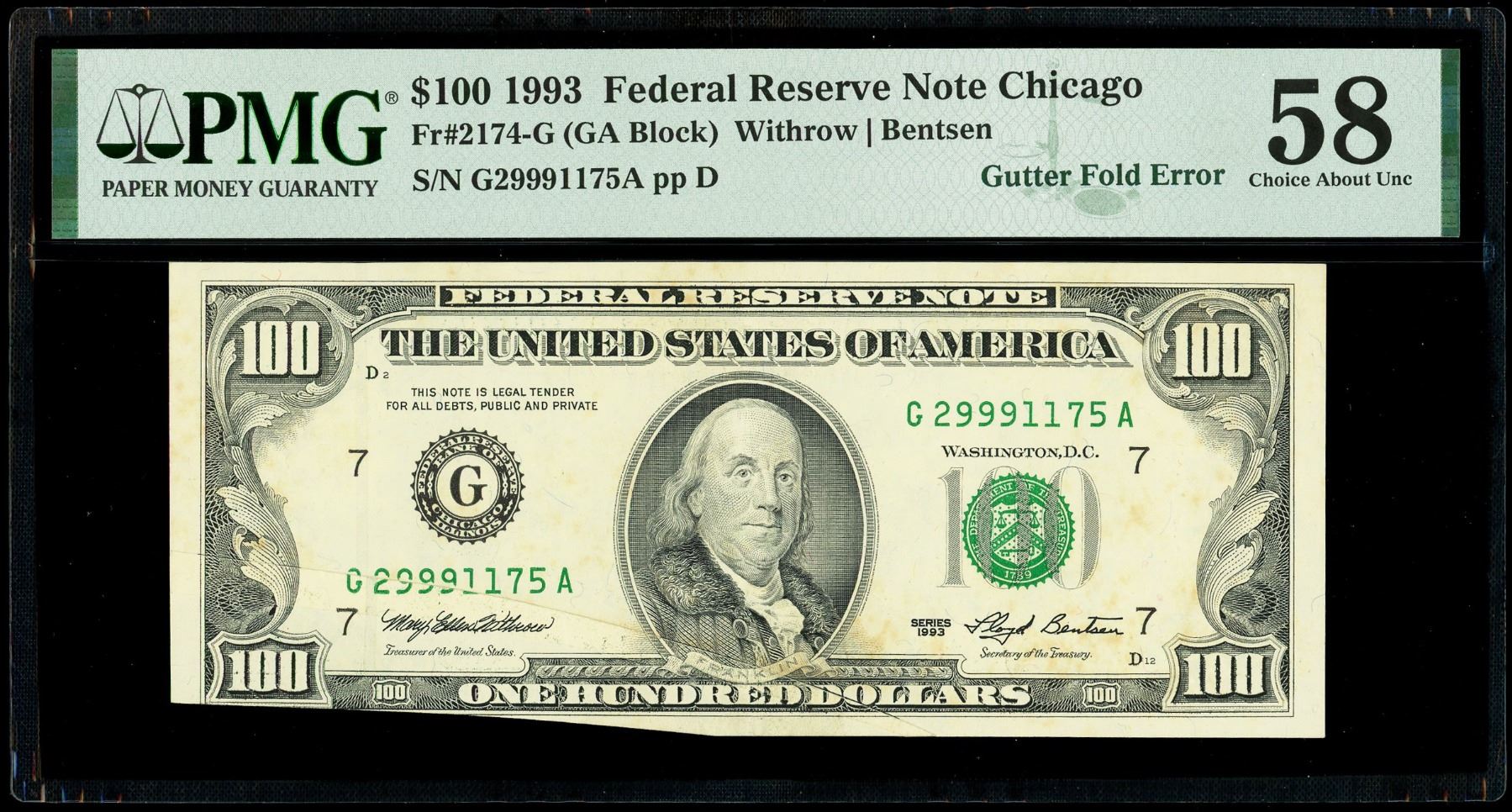 USA, FRB of Chicago, $100 Federal Reserve Note, series 1993, serial G29991175A, with gutter fold error, PMG Choice AU 58. Fr-2174-G. Like the prior lot, a prominent gutter fold error cuts through the design of this $100 bill, some minor paper toning spots. Please use this link to verify the certification number
