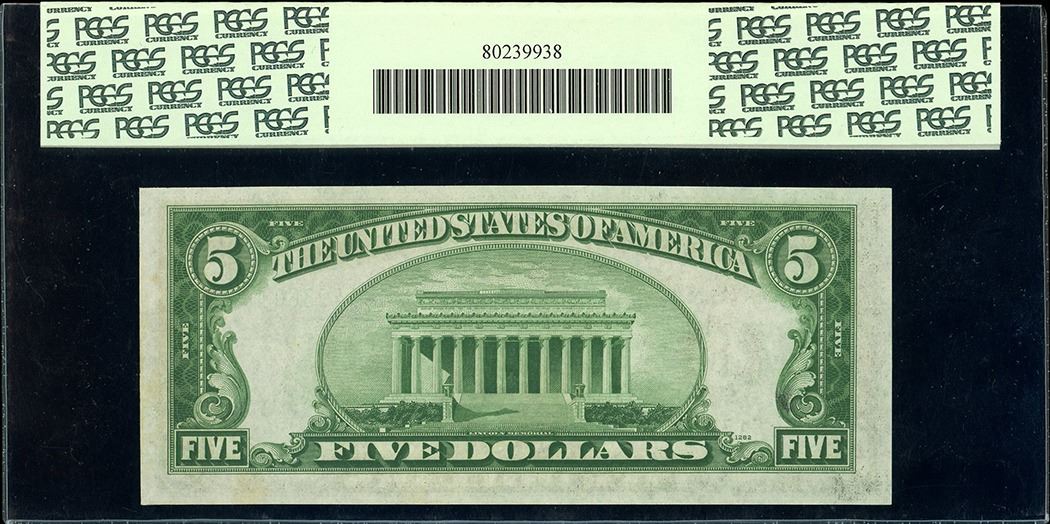 USA, Federal Reserve Bank of Atlanta, $5, series of 1934, serial F17449860A, Julian-Morgenthau, dark green seal, mule error, PCGS Very Choice New 64PPQ, ex-Miami Beach Mansion Hoard. Fr-1956-F. Nice note with strong embossing. (Note: see prior lot for the story on the hoard). Pedigreed to the Miami Beach Hoard.