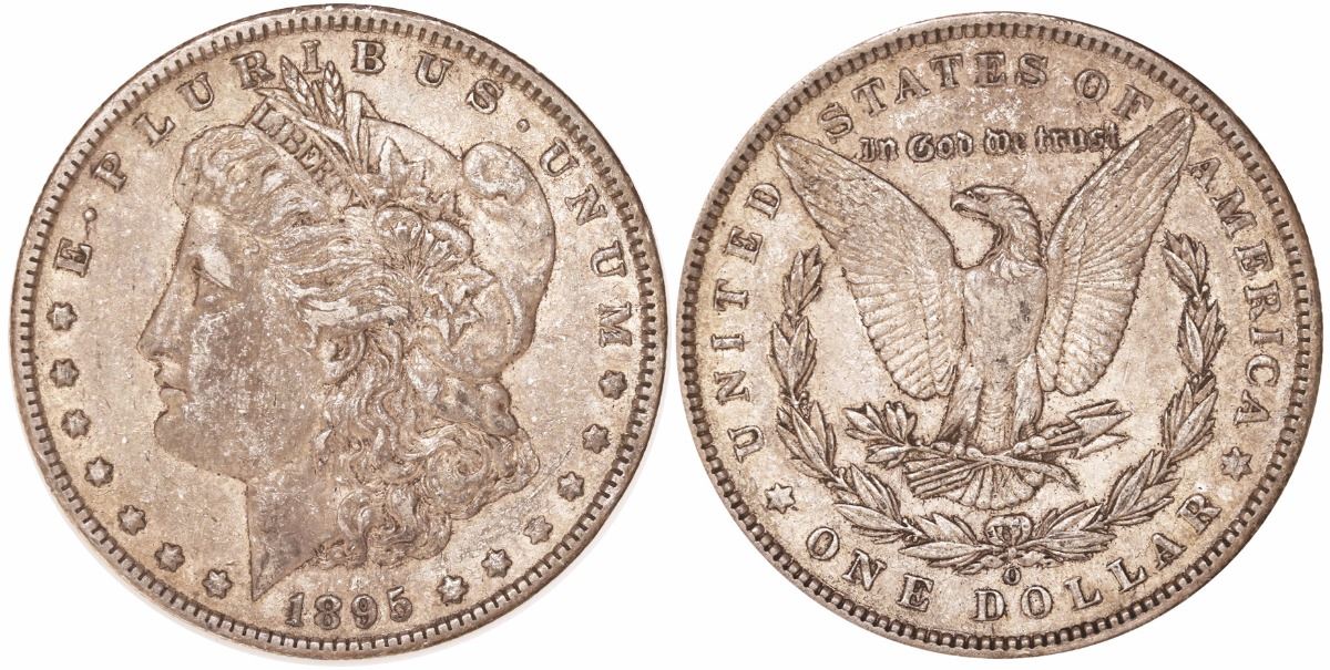 USA (New Orleans), $1 Morgan, 1895-O. KM-110. 26.67 grams. XF with faint toning and traces of luster, no problems. Pulled from circulation in Las Vegas ca. 1956.