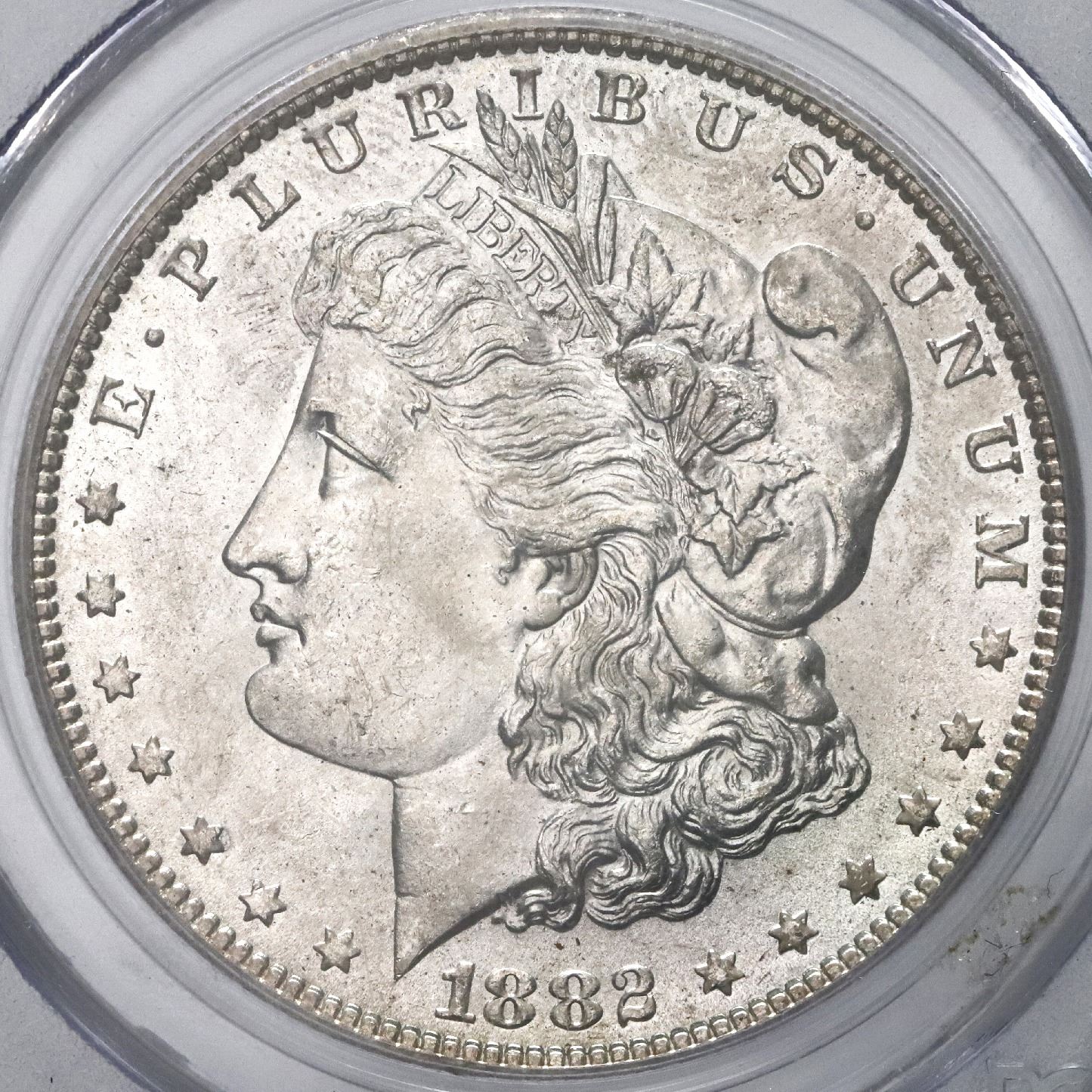 USA (New Orleans Mint), Morgan dollar, 1882-O/O, VAM-7, PCGS MS62. Lustrous surfaces with hints of gold toning around the rims, popular "Top 100" VAM with repunched mintmark. PCGS #04010887.