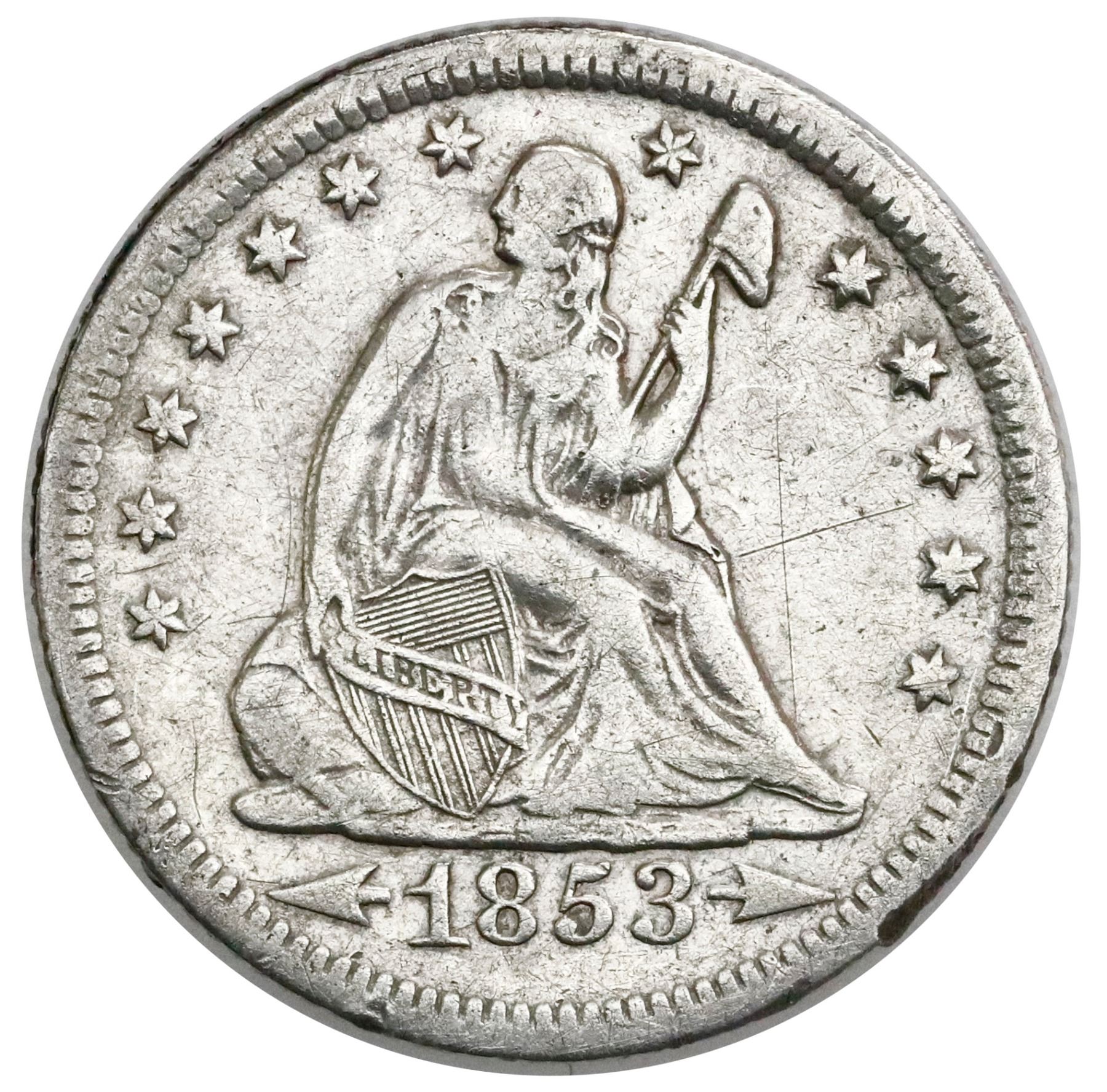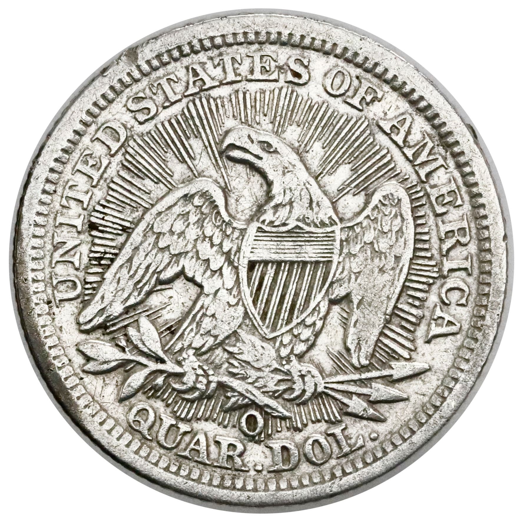 USA (New Orleans Mint), Seated Liberty quarter dollar, 1853-O, arrows and rays, ex-Tuscaloosa Hoard (Civil War era). 6.13 grams. Cleaned VF, interesting provenance. From the "Tuscaloosa Hoard" (1860s) near Tuscaloosa, Alabama, with certificate.