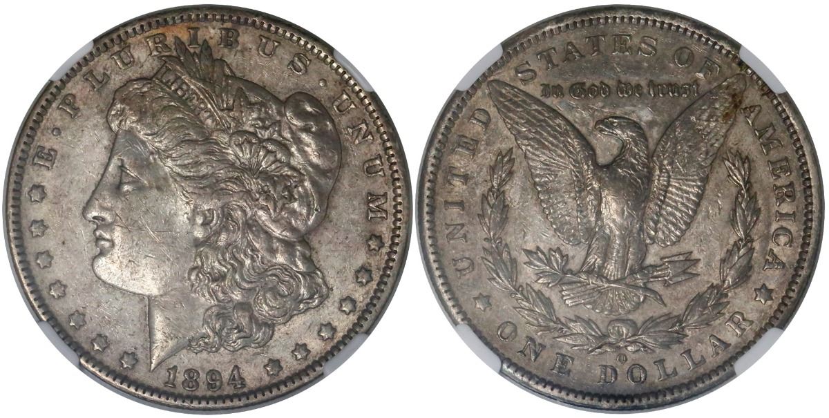 USA (New Orleans mint), $1 Morgan, 1894-O, encapsulated NGC XF 45. KM-110. Number of minor marks, but little wear evident.