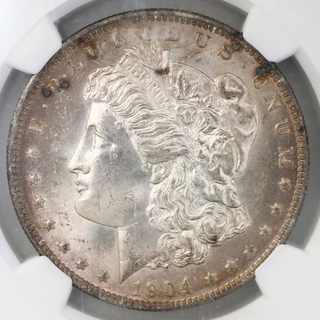 USA (New Orleans mint), $1 Morgan, 1904-O, NGC MS 64. Smooth, lightly bagmarked surfaces with hint of rose toning around legends, quite lustrous. NGC #3770604-144.