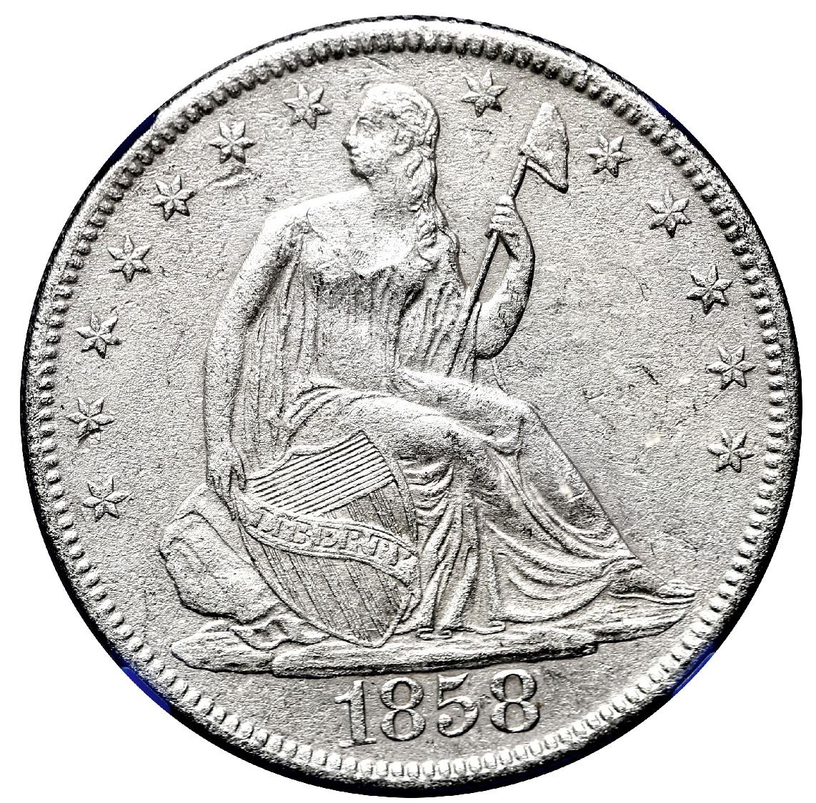 USA (New Orleans mint), Seated Liberty 50 cents, 1858-O, NGC Shipwreck Effect (E) AU / SS Republic Shipwreck Label. Matte surfaces from saltwater exposure, hence the Shipwreck Effect (E) designation, but rather sharp AU details throughout. Recovered from: S.S. Republic, sunk in 1865 off Georgia